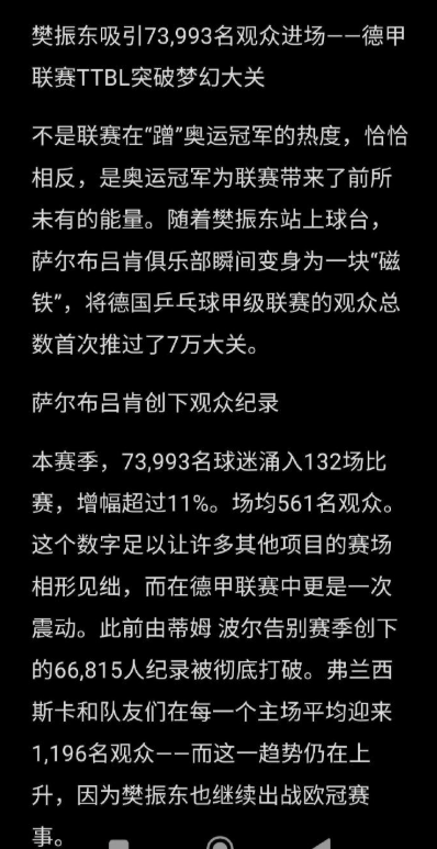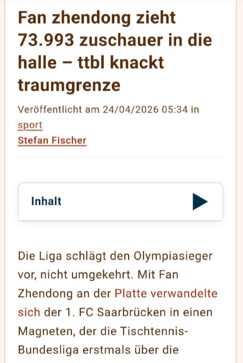 樊振东的“巨星效应”有多震撼? 德甲乒乓球联赛观众总数首次突破7万大关,萨尔布吕肯主场场均观众暴涨至1196人,社交媒体覆盖翻倍、周边销售额飙升68%,季后赛门票直接挤爆系统,二级市场票价翻3倍! 不是联赛蹭热度,是奥运冠军自带流量,把小众运动推到了新高度。