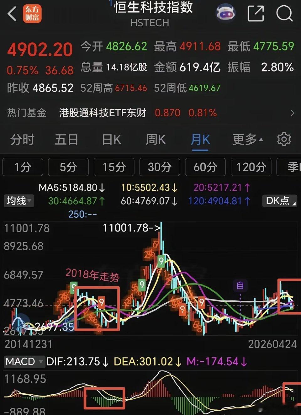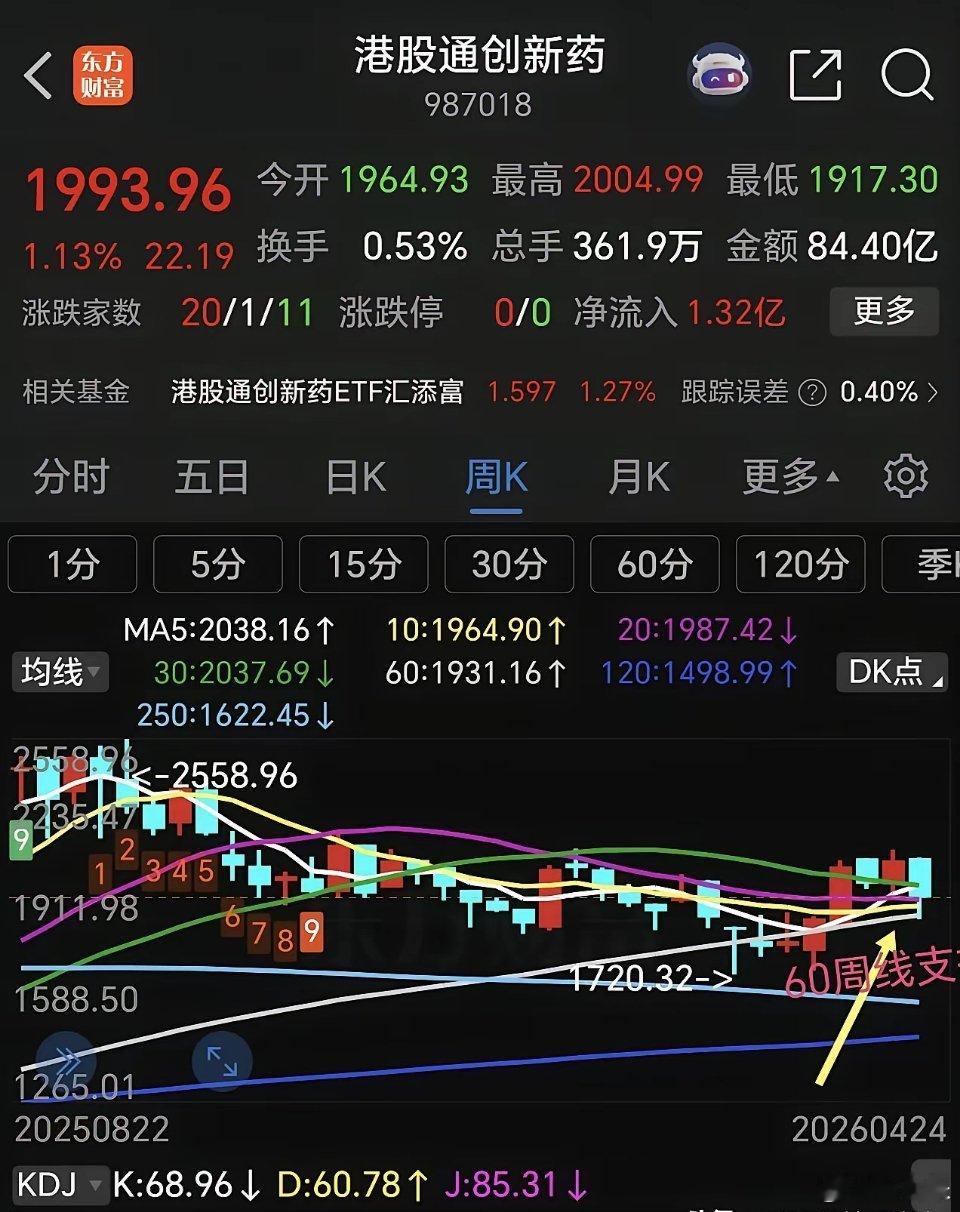 港股通创新药 恒生科技下周走势分析。恒生科技指数前面反弹力度比较弱,连60日线压力位都没有触及就开始回调,目前已经跌破了多条均线支撑,下周5日线开始死叉10日线,周五回补了部分缺口,由于周五美科技板块全面反弹,下周一恒生科技指数有可能高开,如能高开高走,化解5日线死叉10日线趋势,否则,高开低走,就要回补下方缺口,然后继续探底。从它的月线走势来看,月线也是处于下跌趋势,连续下跌6个月了,目前30月线占时获得支撑,假如失守30月线支撑,后期将继续探底,甚至会复制2018年行情(方框内走势),但愿不会这样走,否则26年都没有好日子过。 港股通创新药,港股通创新药表现也是不及预期,反弹到压力区域就回头下跌,已经连续下跌一周。本周五守住了60日线支撑,但是,5日线已经死叉10日线,macd刚刚死叉,短线回调没有结束。假如在60日线支撑止跌反弹,有可能继续挑战前面高点,否则会继续下探。 港股通创新药已经跌破了5 周线支撑,但是守住了60周线支撑,大趋势还没有破坏。不过这个位置不能再继续下跌,否则真的会回踩前面低点,空间有点大! 整个港市几大指数表现都比较弱,不放量拉升很难走出泥潭。