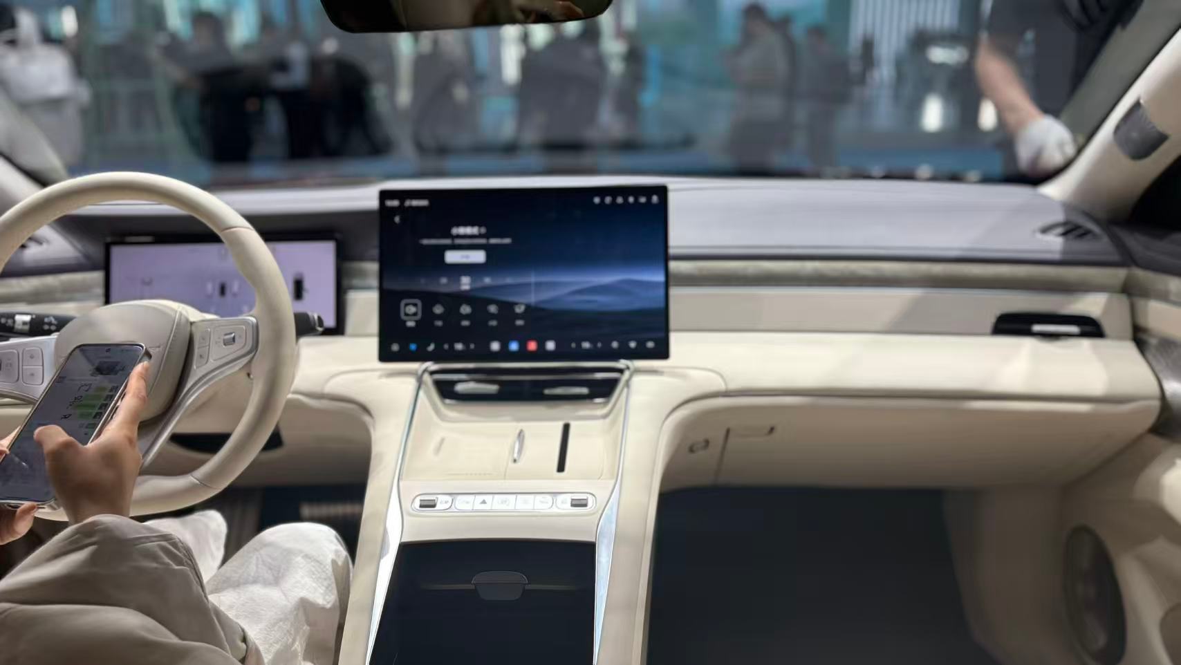这次海豹08的内饰在北京车展首秀。它以破晓海平线作为视觉主轴,带来良好的开扬感,漫反射氛围灯与大面积软包材质、光韵贝母饰板结合,形成温和而高级的空间质感,结合米色内饰配色,整体审美达到较高的水平。3030mm轴距下驾乘空间同样阔绰,全车双层隔音玻璃、电吸门、前排双零重力座椅、后排电动腿托和全车座椅通风/加热/按摩,则能给乘客提供舒适的出行感受。