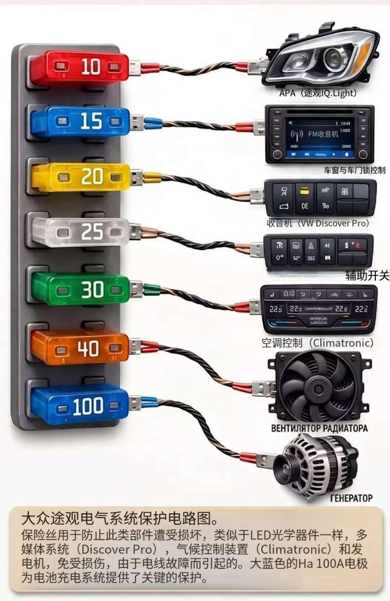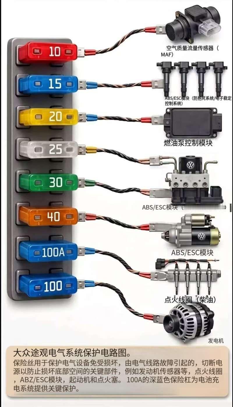 🚗 车子打不着火/发动机抖动? 先别花几百叫拖车! 一个小保险丝就能解决! 很多时候问题不是大故障, 就是引擎舱里这个小小的塑料方块! 存好这份途观保险丝速查,关键时刻救你一命! 🔌 10A(红色) ✅ 负责:进气压力传感器 ⚠️ 故障表现:车子变肉、没劲儿、油耗飙升 ⚡ 15A(蓝色) ✅ 负责:点火线圈 ⚠️ 故障表现:没火花、发动机直接打不着 📻 20A(黄色) ✅ 负责:燃油泵控制模块 ⚠️ 故障表现:油泵不工作、供油不上 🛑 30A(绿色) ✅ 负责:ABS/ESC车身稳定系统 ⚠️ 故障表现:刹车防抱死失效,关乎安全! 🔑 40A(橙色) ✅ 负责:启动机 ⚠️ 故障表现:拧钥匙没反应、毫无动静 🔥 100A(蓝色) ✅ 负责:柴油车预热塞 + 发电机主保护 ⚠️ 故障表现:柴油车难启动、发电机不充电 双手点赞 💡 别让小故障毁了你的计划! 存好这份图,转给开大众的朋友,理性排查电路问题! 👇 评论区告诉我,你想看哪个车型的保险丝图解?汽车冷知识