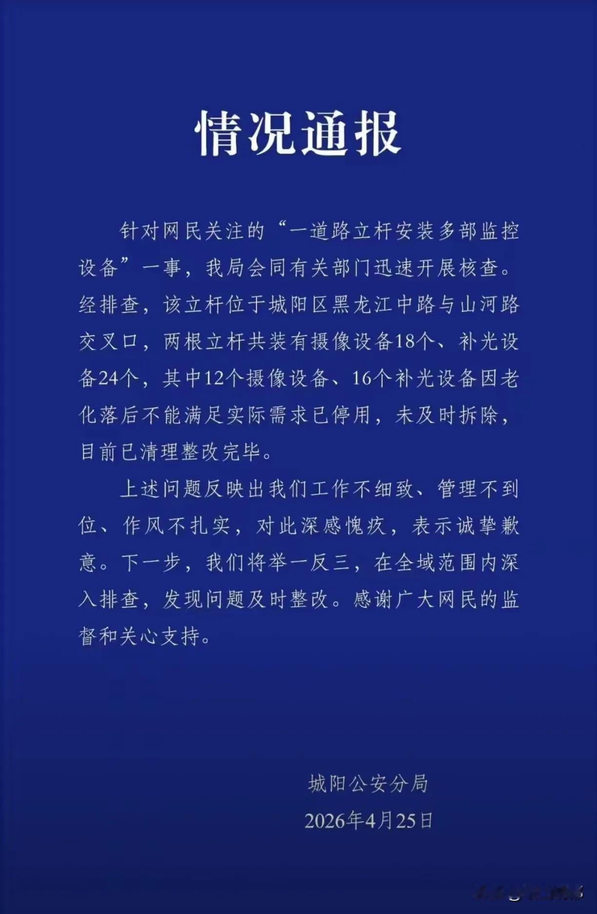 摄像头、照明灯,密密麻麻,青岛市城阳区黑龙江中路与山河路交叉口一道美丽的风景线,有关部门回应来了。由此联想到,如此这般在我的你的城市街道口上还少吗?是不是也应该举一反三来个大扫除呢?!