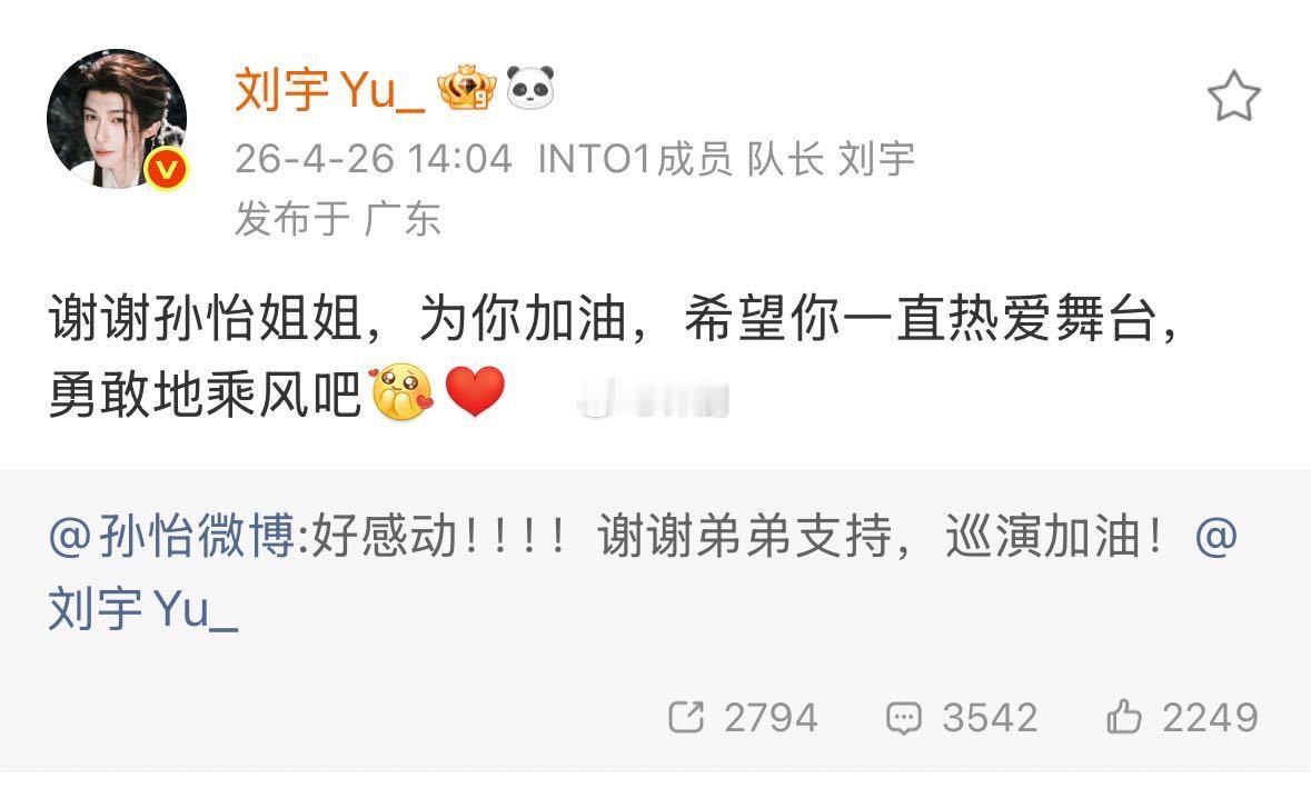 孙怡感谢刘宇 闭环了家人们!五年前的加油,五年后的护航,祝孙怡在浪姐一路顺利,舞