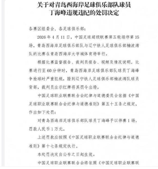 中超又现“功夫足球”!青岛西海岸丁海峰飞踹费利佩,裁判黄牌变红牌,VAR介入才罚下,中足联仅停赛1场+罚款1万,网友怒斥:“这钱连球鞋都买不起!”💢粗暴犯规屡禁不止,裁判判罚争议大,罚单太轻成变相鼓励!从背后飞踹,若非外援强壮,后果不堪设想,裁判却先给黄牌,VAR不介入就蒙混,这裁判还有啥用?🤔停赛场次翻倍,罚款与薪资挂钩,追加内部纪律处分!让球员知道,踹人成本高,收益低,才会收敛!💪中超若想摆脱“功夫联赛”标签,必须让罚单长牙齿!规则不是摆设,暴力必须严惩!👊你们支持重罚丁海峰吗?快来留言,一起为足球正名!