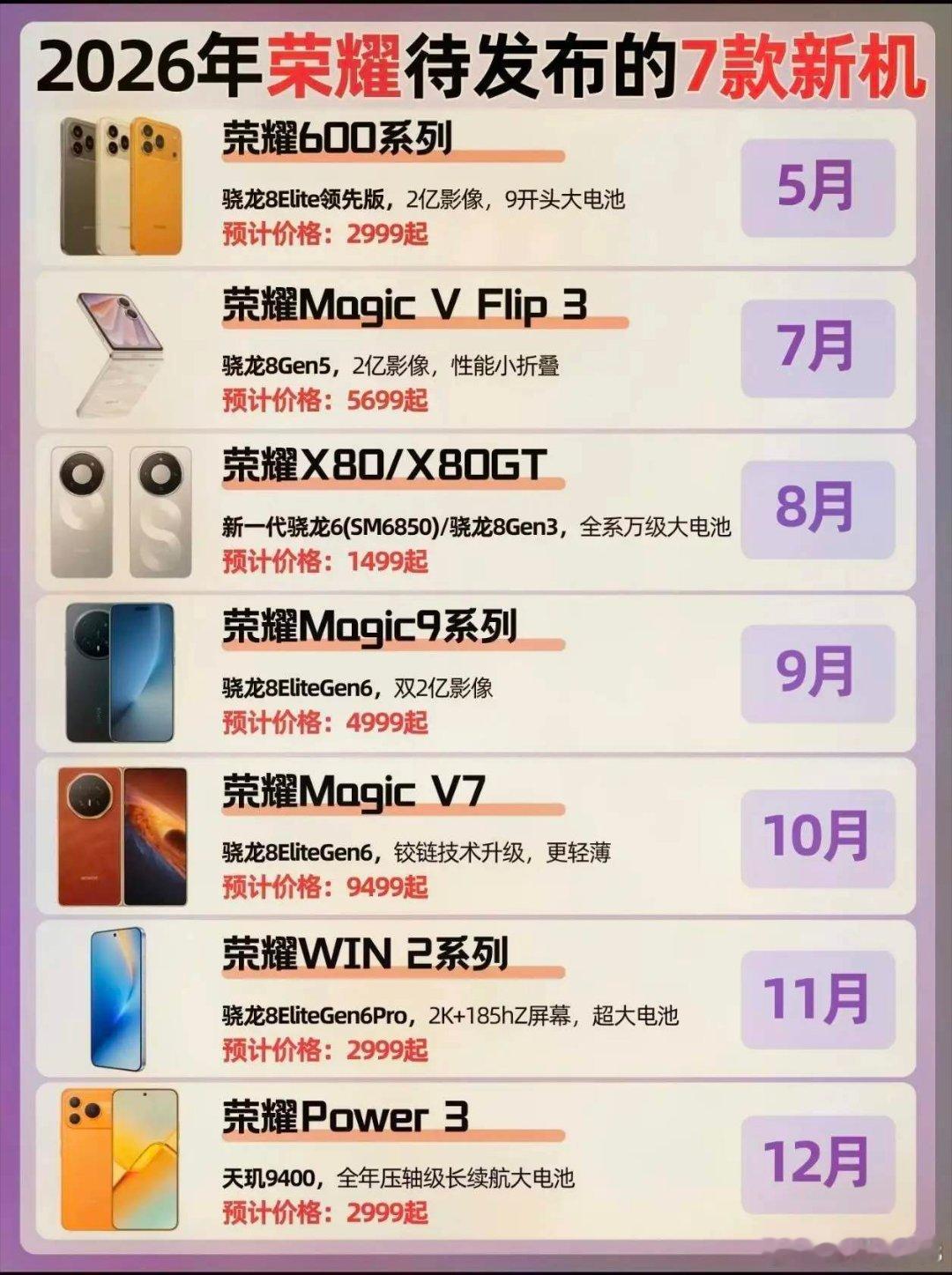 荣耀2026产品线全面翻新:从Magic旗舰到X80性能档,从折叠屏V7到WIN2新物种,全系续航冲顶。Power3直击电量焦虑,V Flip3继续轻薄折叠路线。一波接一波,不卷参数卷体验。