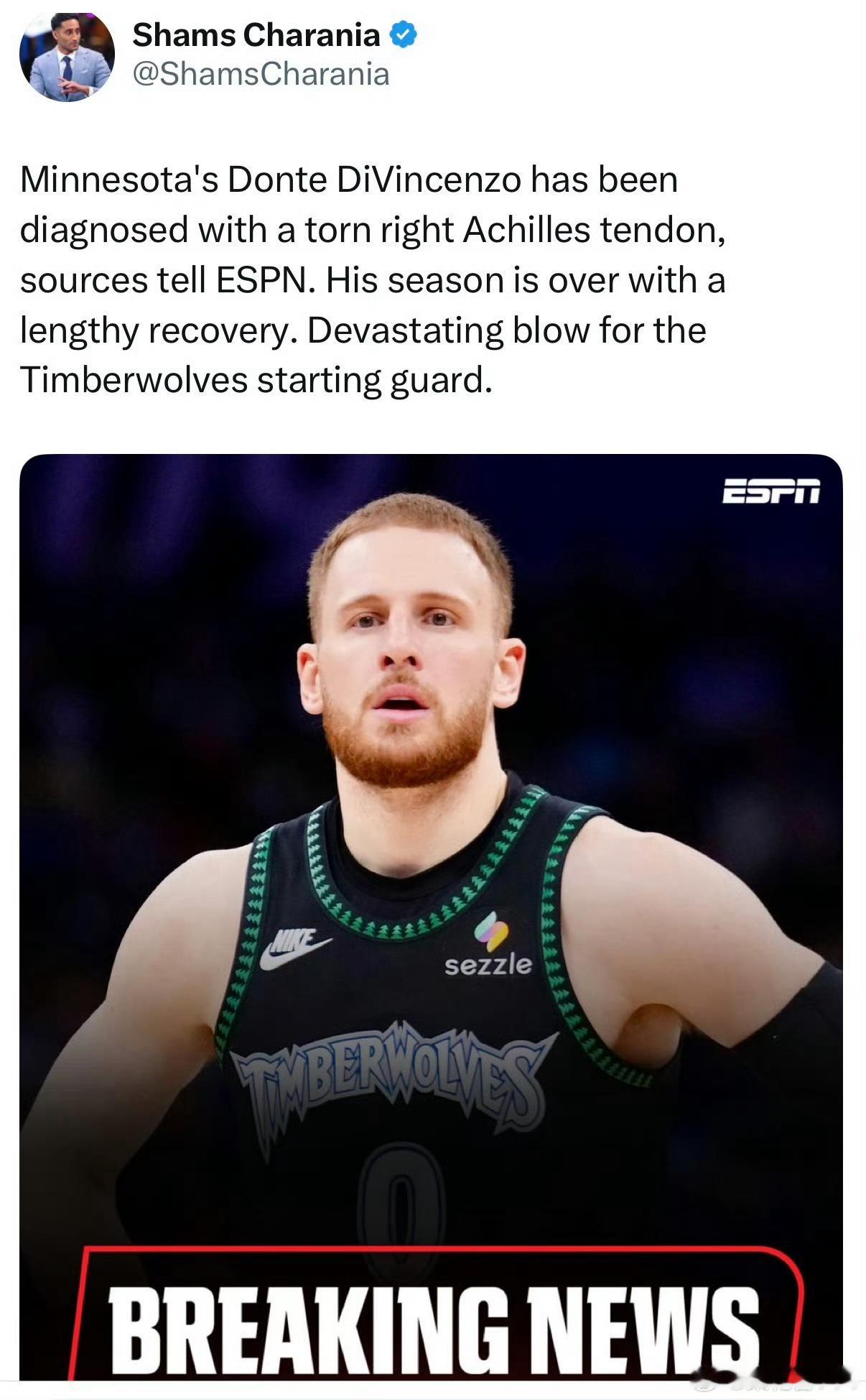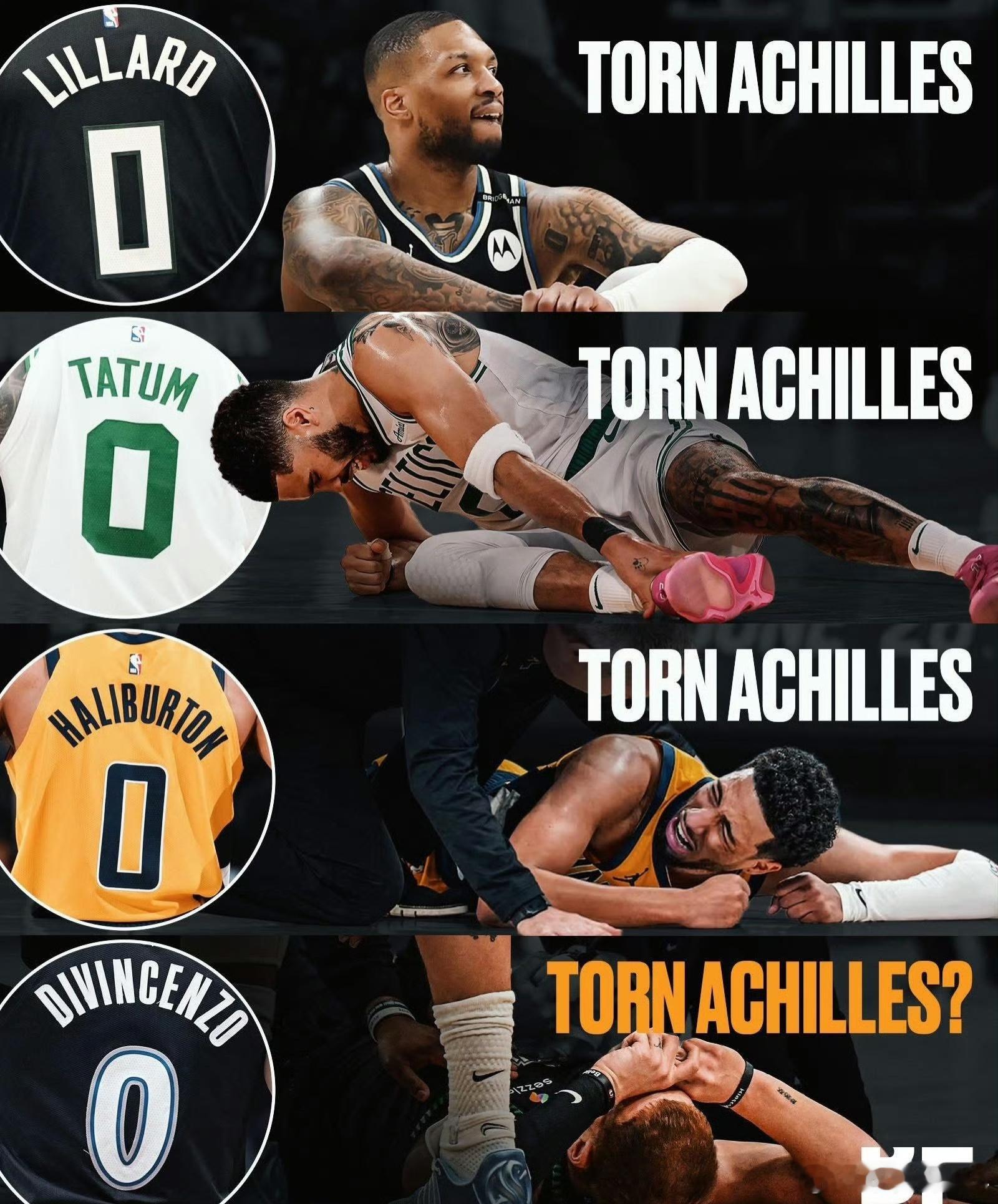 这场比赛开场仅仅79秒,首发主力迪文琴佐在一次无对抗的拼抢中突然倒地,随后紧紧捂住自己的右腿后侧,搀扶离场!据shams爆料前者右跟腱撕裂,赛季报销!从去年季后赛到至今已经倒下四位0号的球员,分别是(塔图姆,利拉德,哈里伯顿以及迪温)且这四人均是因为跟腱撕裂!