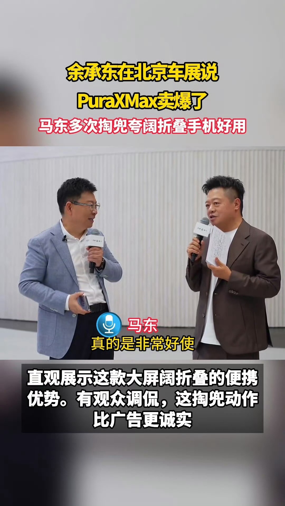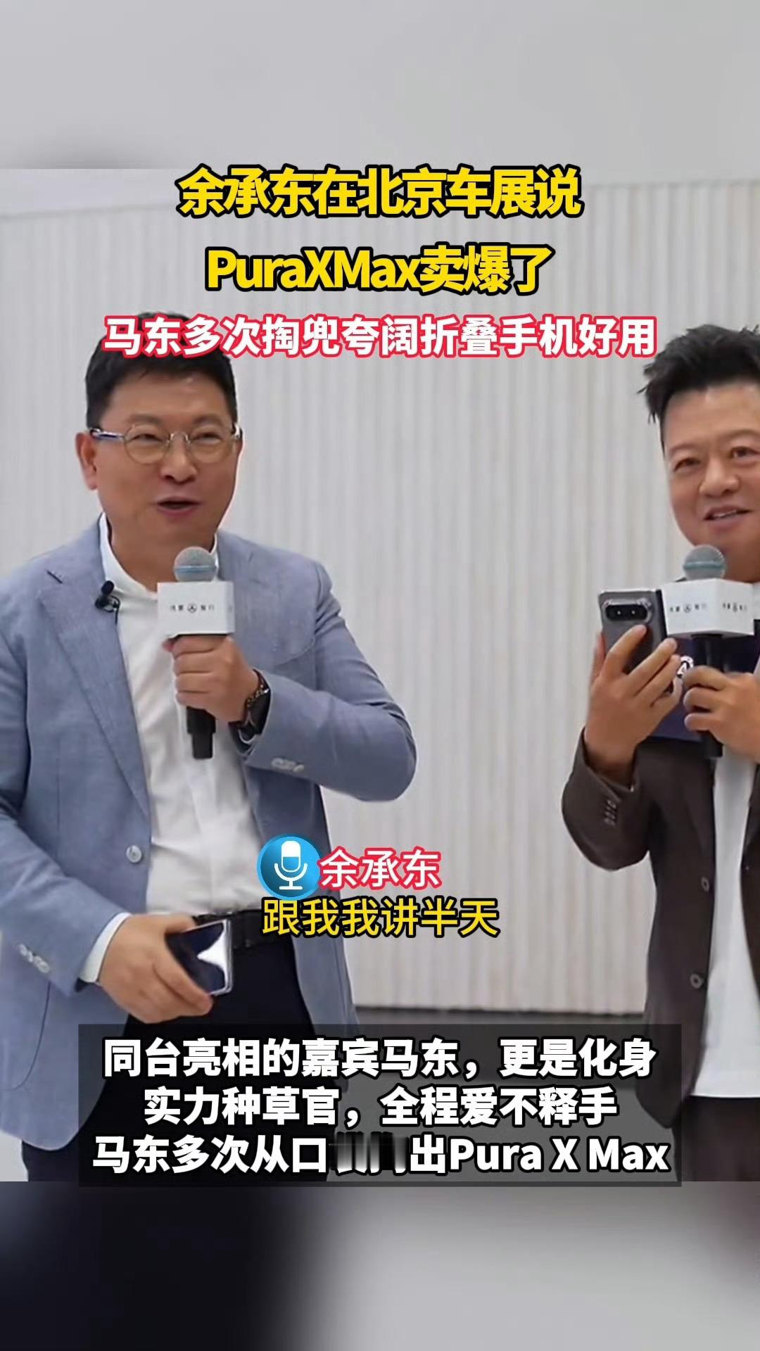 余承东在北京车展说PuraXMax卖爆了马东多次掏兜夸阔折叠手机好用 华为Pura X Max成爆款,余承东在北京车展坦言销量火爆,市场热度一路狂飙,马东全程爱不释手,多次掏兜展示使用场景,夸大阔折屏实在太好用了。