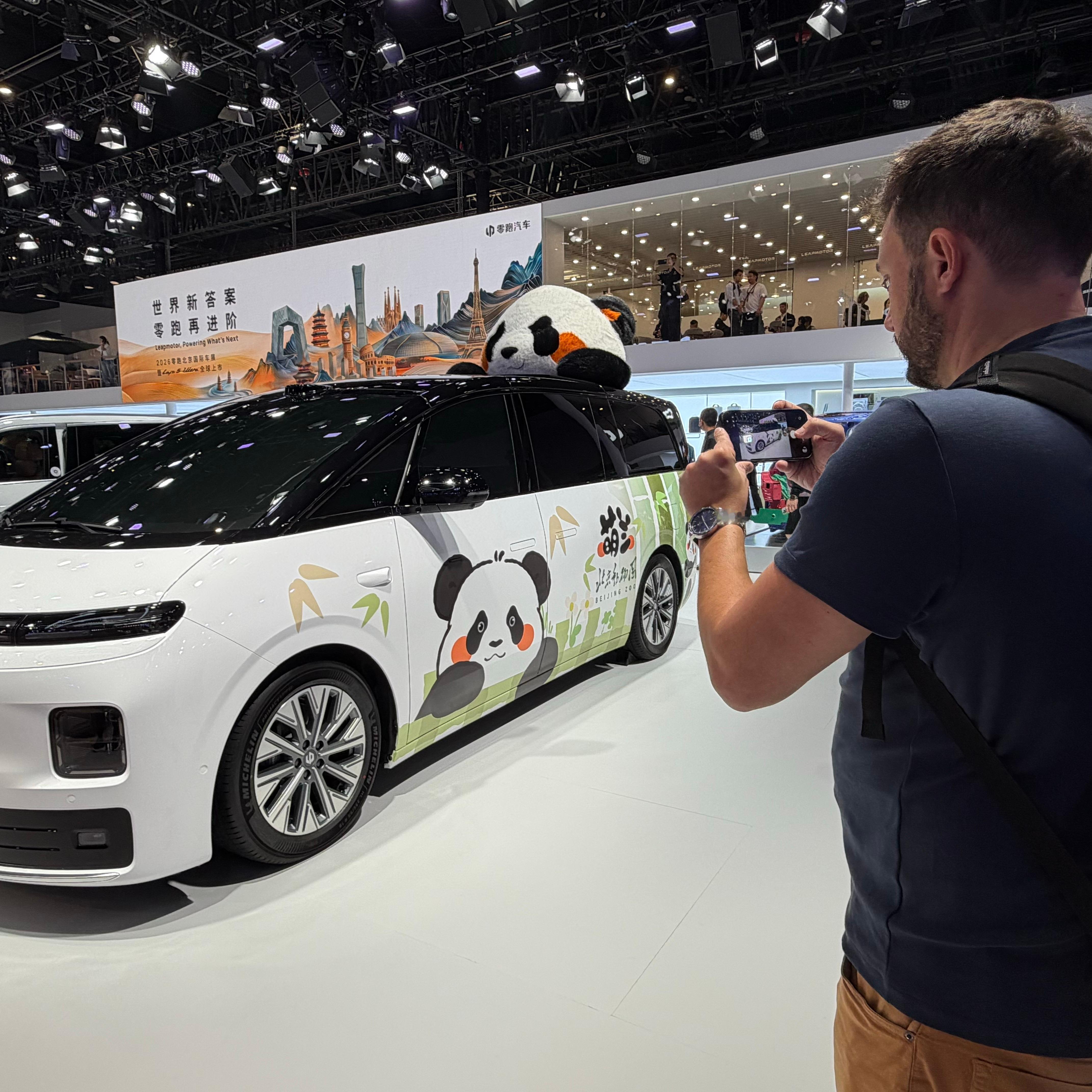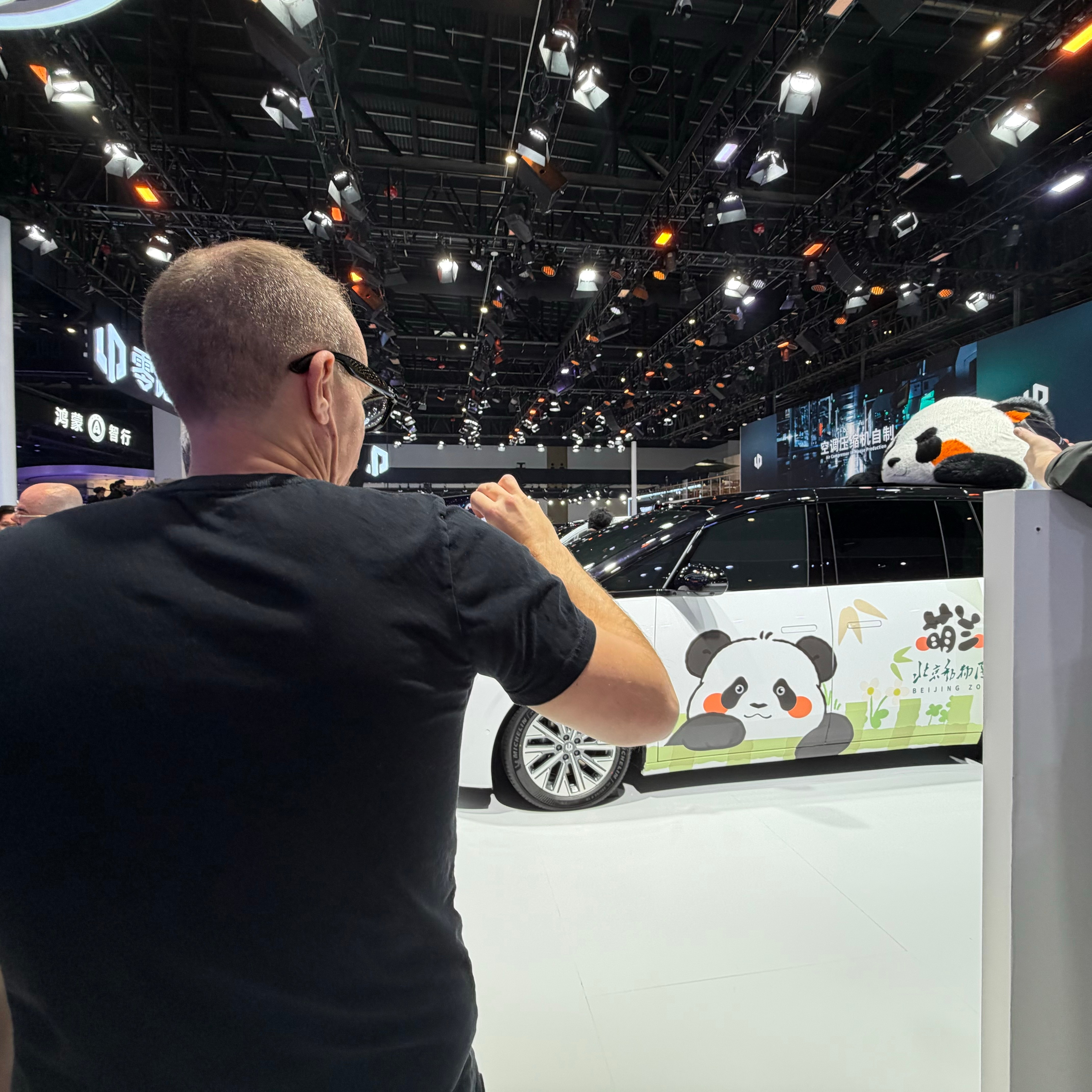 外国人又被熊猫硬控了 北京车展,零跑展台放了一台萌兰涂装的熊猫定制车。现场有不少外国观众打卡,上一次老外被熊猫硬控,还是在动物园,想不到这一次是一台MPV。