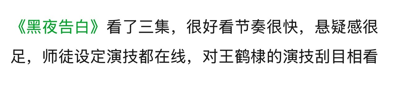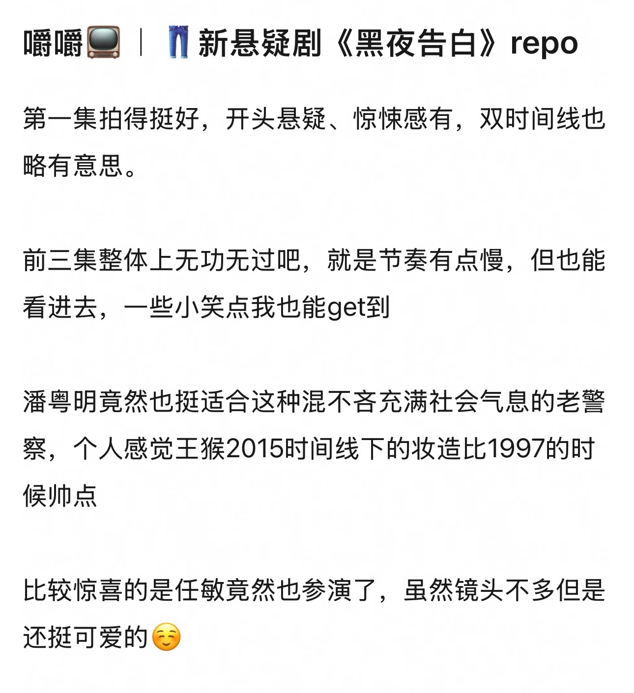 黑夜告白首播口碑黑夜告白今天上线了,我看了下郫县的评价,总体还不错,很多人说悬疑感很足,看的也很爽,节奏蛮快的,演员的演技也在线~