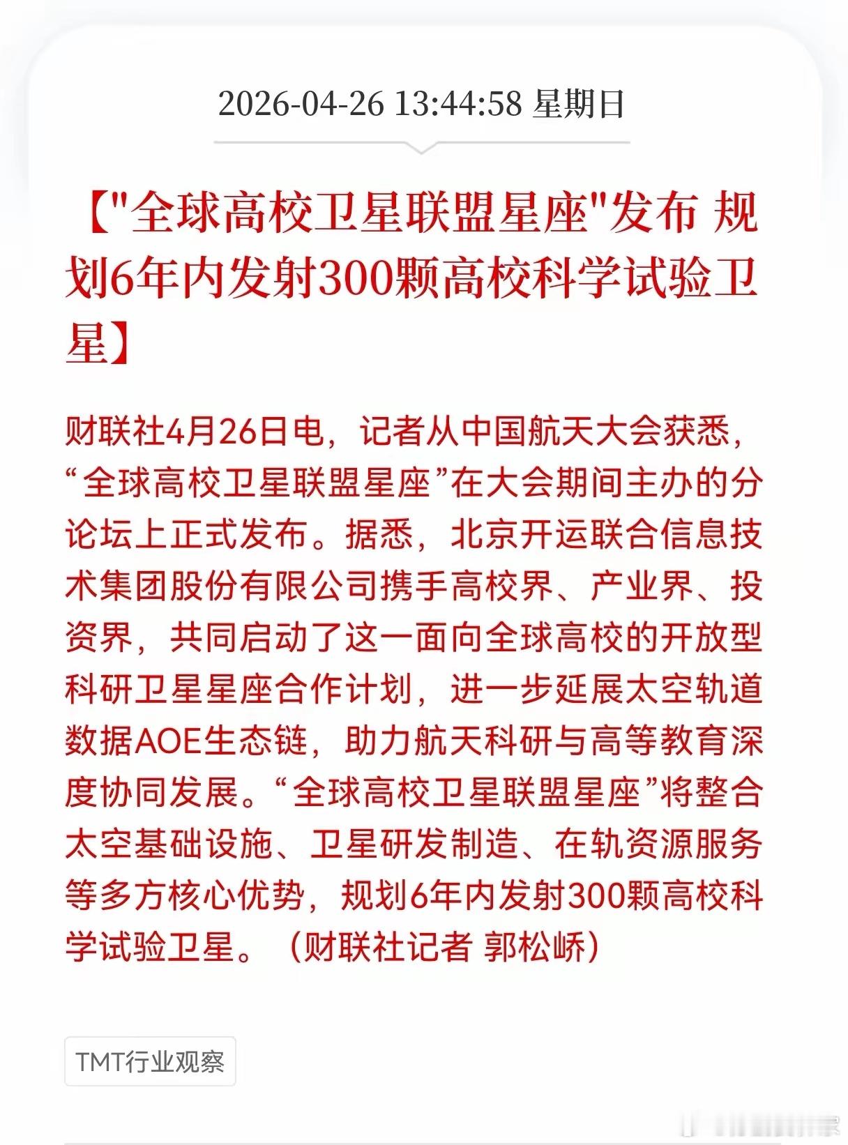 利好!周末重大利好消息!商业航天方向传来实质性利好!全球高校卫星联盟星座,规划6年内发射300颗高校科学试验卫星,商业航天迎来实质性利好4月26日,从中国航天大会传来重磅消息:"全球高校卫星联盟星座"计划正式发布,北京开运联合信息技术集团携手高校界、产业界及投资界,启动面向全球高校的开放型科研卫星星座合作项目,规划6年内发射300颗科学试验卫星,为中国商业航天注入全新动能。此次联盟星座计划打破了传统航天科研的壁垒,整合了太空基础设施、卫星研发制造、在轨资源服务等多方核心优势。不同于以往单一高校的小型卫星项目,300颗卫星的规模部署将形成覆盖广泛的天基观测网络,重点解决高校科研中"有想法缺平台"的痛点。根据规划,联盟将开放卫星搭载、在轨验证等全流程服务,公开征集载荷研制与应用方案,让高校科研团队能直接参与到卫星全生命周期的研发中。从产业布局来看,这一计划精准衔接了国家商业航天战略。当前,中国正加速构建通导遥一体化天基信息服务体系,而高校作为创新人才培养的主阵地,其参与度直接决定产业未来的技术高度。开运集团此前通过"星汉计划""天选计划"已与哈工大、北航等18所顶尖高校达成合作,此次联盟星座的启动,更是将校企协同推向新高度。 300颗卫星星座发射是人才培养的"实战课堂"。学生可全程参与卫星设计、数据处理等环节,将课堂理论转化为在轨验证成果,真正实现"产学研用"深度融合。同时,联盟将构建太空轨道数据AOE生态链,为高校科研提供持续的数据支撑,推动航天技术成果向产业转化。随着300颗卫星的逐步部署,中国商业航天将迎来高校参与的黄金时代。这不仅是航天技术的普及,更是创新生态的重构,为中国从航天大国迈向航天强国筑牢人才与技术双基石。