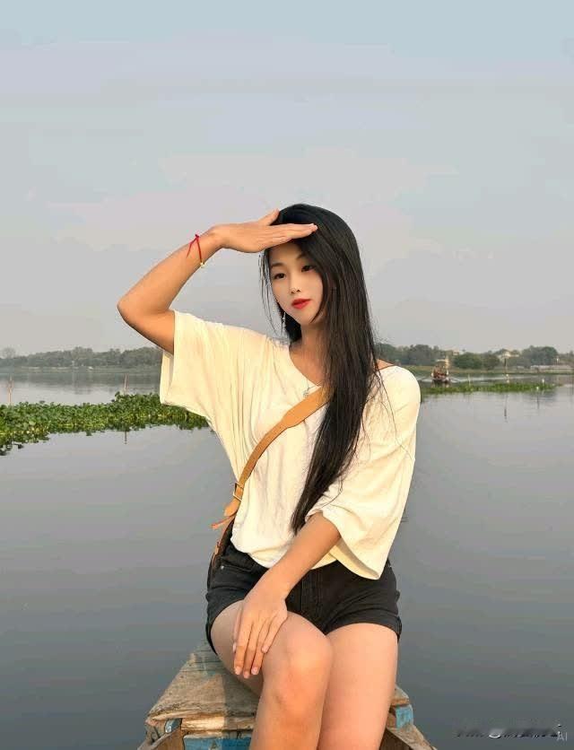 夏日乘船游,白衣飘飘,黑裙飘逸,水天一色,悠然自得。
