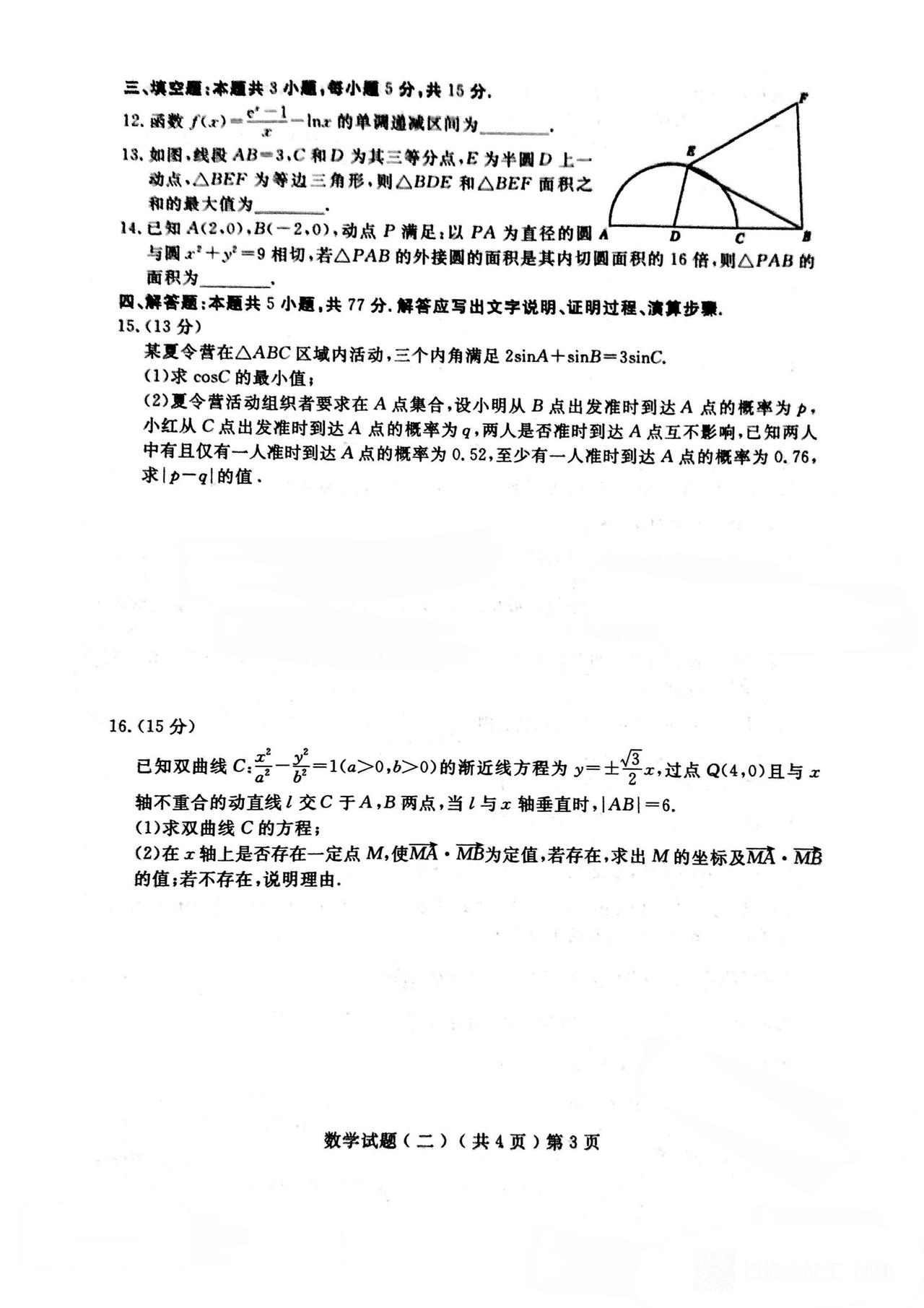 安徽省埠阳市2026届高三4月调研测试数学试题及答案