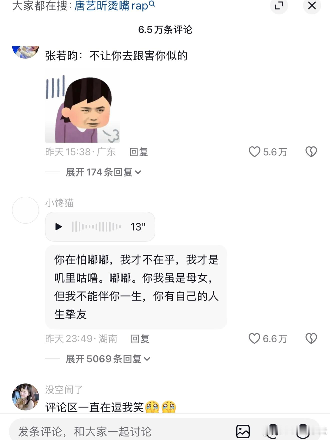 唐艺昕那段烫嘴rap,我真的看一遍笑一遍,评论区比节目还好笑。笑着笑着,顺手点开张若昀的视频,好家伙,那边评论区也已经沦陷了这季浪姐到底走的什么路子,跟上一季画风完全不在一个频道