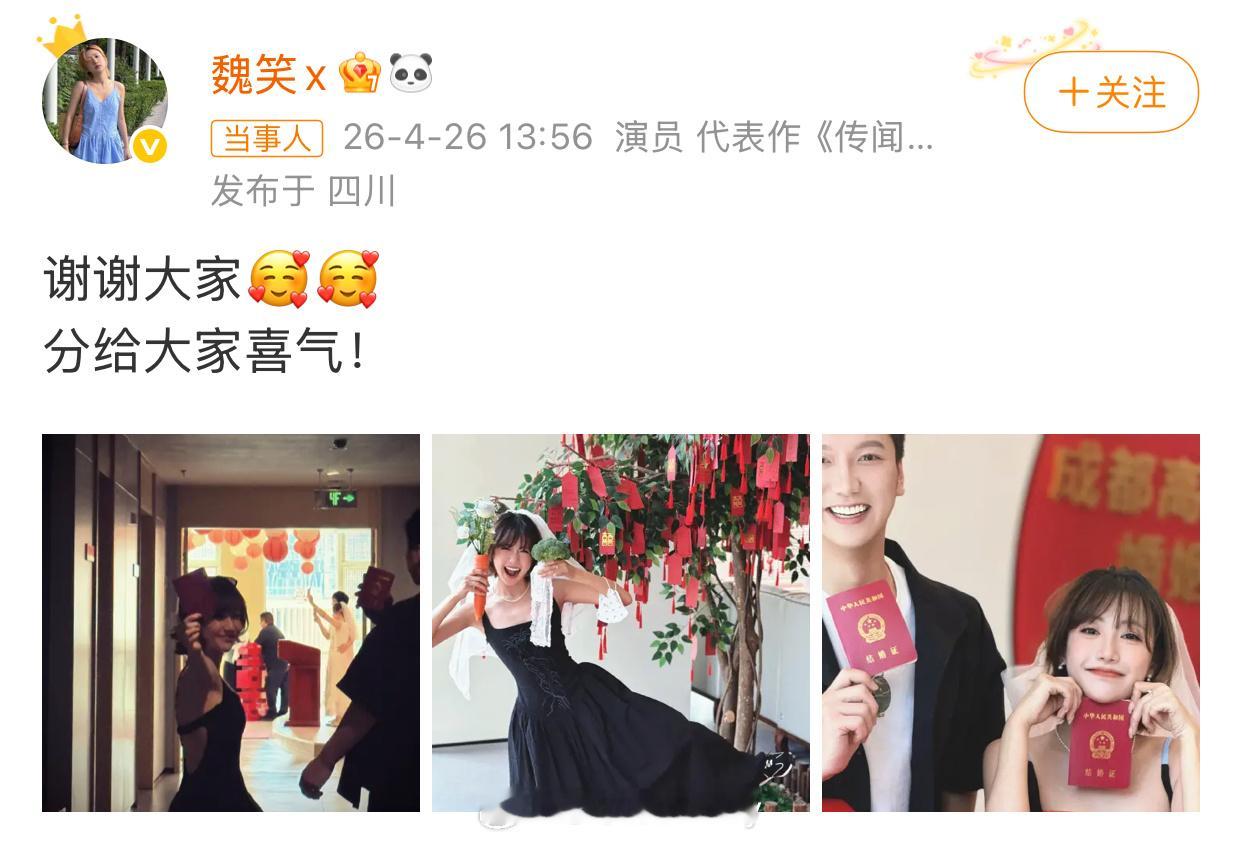 魏笑官宣结婚领证,好闺蜜赵露思也去了,曾黎也发博祝福魏笑结婚