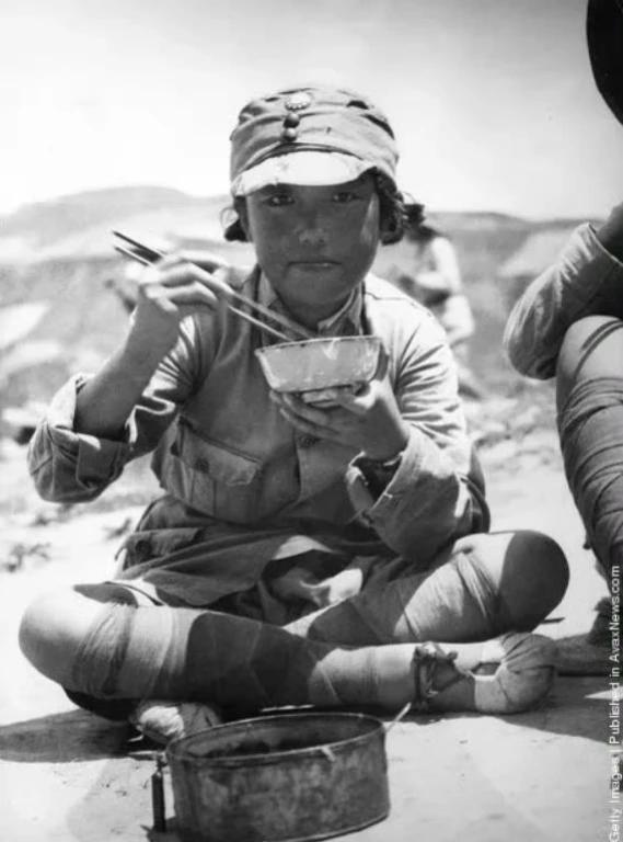 抗日战争中,西方记者发现的“小脚女战士”!1943 年前后的华北敌后抗日根据地,太行山一带,一个外国战地记者,为一个正在吃饭的八路军女战士,或者是根据地自卫队员,拍下这张特写照片,后来被Getty Images 等机构收录,成为二战时中国女性参加战争的标志性证据。 这种人物特写的拍摄手法,非常西式,对于人物表情的抓拍,处理得非常细腻。她如果没有穿上军装,就是一个才十几岁的小女孩。 她穿的是八路军的制式军装,戴的是青天白日徽的八路军军帽,正盘腿吃饭,在用筷子吃饭,碗和金属饭盒,都能看出来比较陈旧了。 但是,仔细看她的脚,还能能看出点问题来,厚厚的裹脚布和小码的布鞋,这就是旧时代裹脚的痕迹。这样的女孩子,从原来的被压迫者,转变为战士,这是时代洪流下,对个人命运的冲击。国难当头,也给她了机会,冲破家庭的枷锁,参与到社会事务中来。 但是这种照片给人的冲击,可能还是她幼小的年纪。背靠荒野,但旁边有她的战友。参加革命,有饭吃,队伍里人人平等,这可能是她最好的出路。虽然年纪小,但是她的眼光很长远。 至少,这张外国人拍的照片里,能够看出中国女孩特有的大气和平和,这样的眼神非常令人震撼。