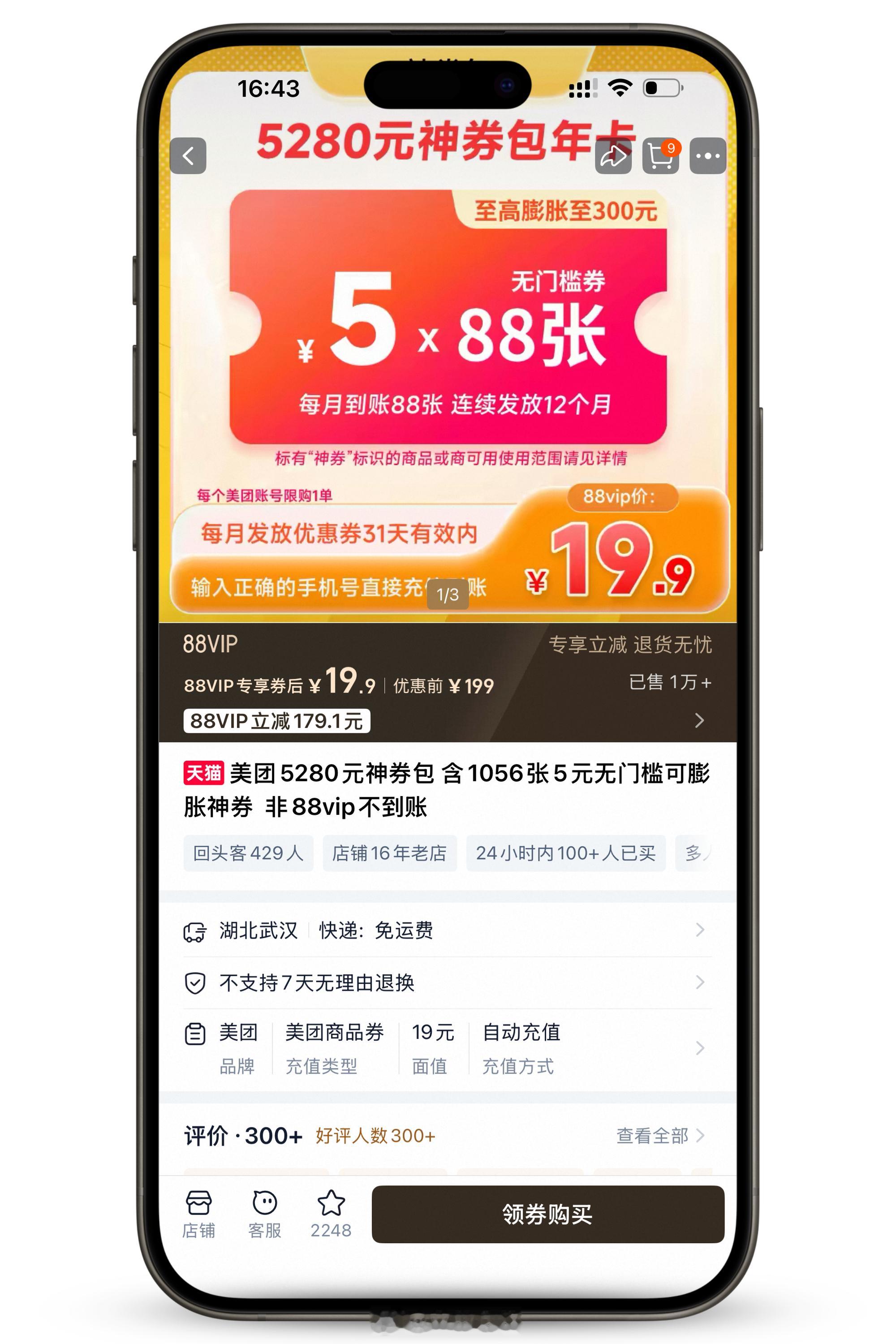 美团神券包,5 元无门槛88张,仅需19.9元不过需要 88VIP 会员才有效美团5280元神券包 含1056张5元无门槛可膨胀神券 非88vip不到账