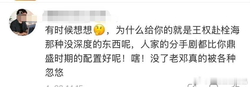 老呃粉丝酸的流口水,自己也承认人家的分手剧配置都比哥哥所谓全盛时期的剧配置好。 刚才有个前呃粉也说佳偶天成蛮好看的。