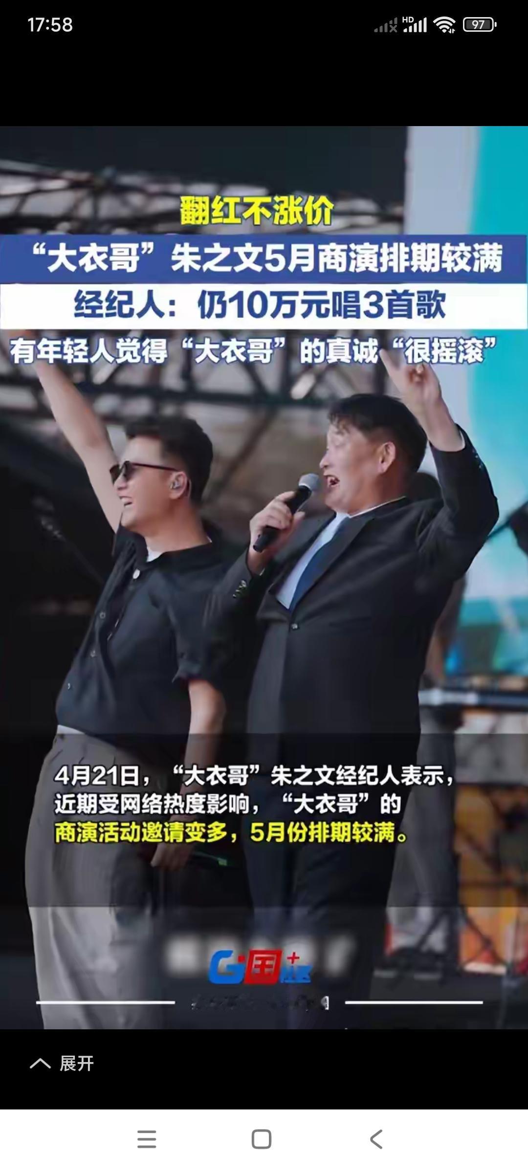 辱骂朱之文的人,现在心里是不是拔凉拔凉的。 越骂朱之文越火,5月份的档期,商演已经排得满满的。 虽然红的发紫,商演不涨价三首歌10万元钱。 这一个月下来多少钱?一年挣多少钱,你们仔细算算。 奉劝一些人,心怀善良,别嫉妒了,没有用。