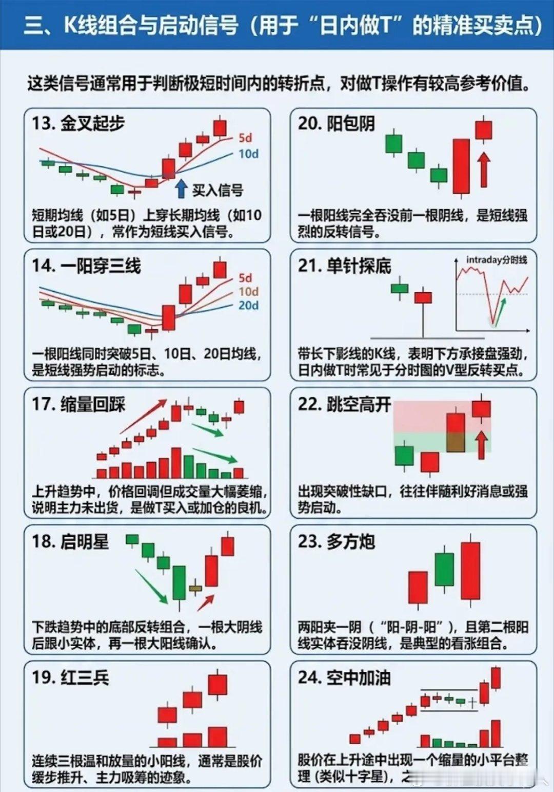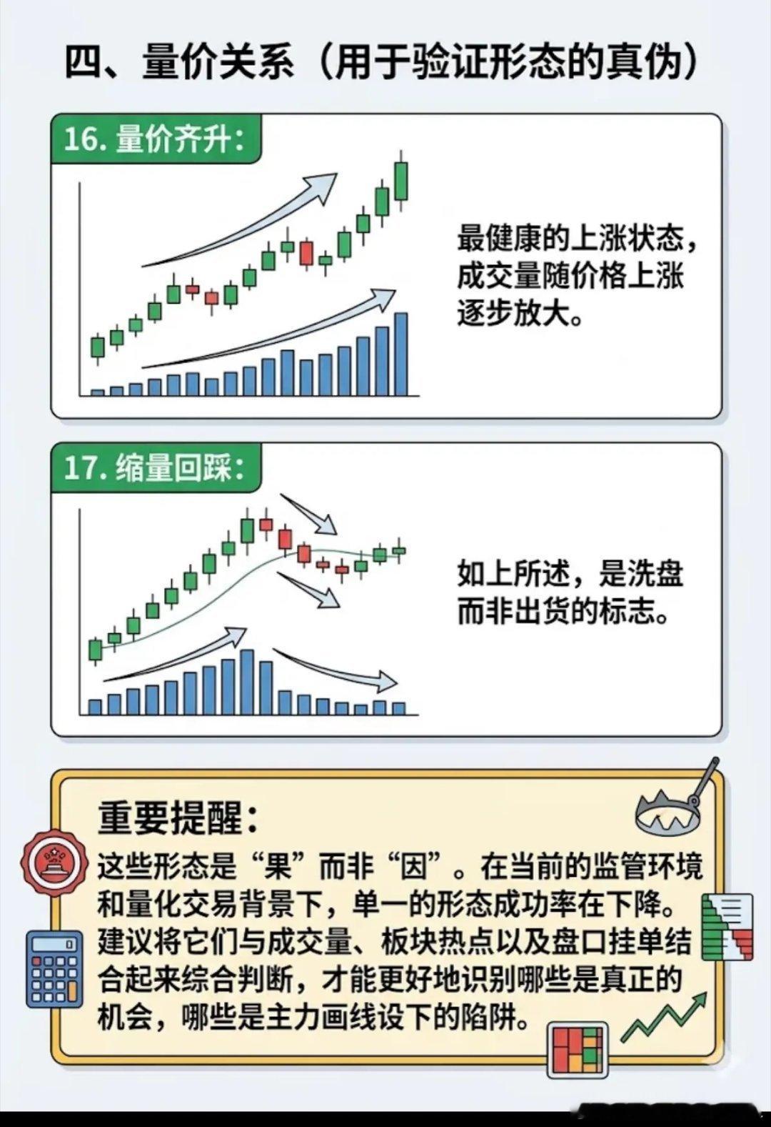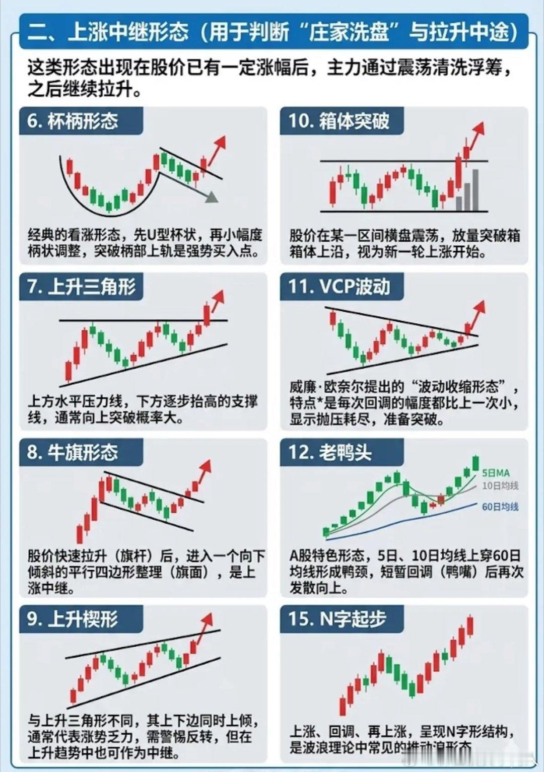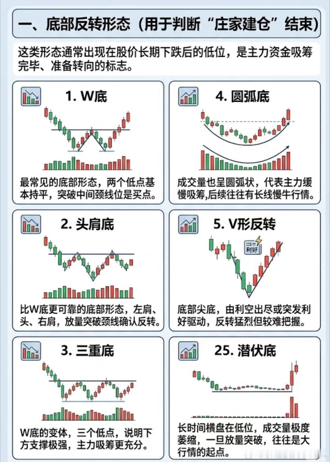以大概率信号,搭建底部至拉升的完整交易体系A股没有绝对精准的技术形态,依托历史行情沉淀的高概率信号,可搭建高胜率交易体系。各类K线形态,本质都是主力资金运作的规律体现。1. 底部反转:捕捉主力建仓完成信号头肩底、W底、三重底为核心反转形态,头肩底可靠性最强,放量突破颈线代表空头衰竭;圆弧底、潜伏底为长线吸筹形态,低位长期缩量横盘后放量突破,易开启大级别行情;V形反转多为利好驱动,仅作辅助参考。2. 上涨中继:识别洗盘结束延续拉升杯柄形态、上升三角形、牛旗形态、老鸭头、VCP波动、箱体突破,是上涨途中经典洗盘信号。回调幅度逐级收窄、支撑稳固,放量突破整理区间,便是二次拉升的关键节点。3. 短线启动:锁定日内精准买卖点一阳穿三线、金叉、红三兵为强势启动信号;单针探底、阳包阴、多方炮为短线反转买点;趋势内缩量回踩、空中加油,是低吸加仓的优质机会,适配日内做T与短线博弈。4. 量价配合:甄别形态真假核心量价齐升代表上涨动能充足、资金接力顺畅;上升趋势缩量回调,判定为洗盘而非出货。所有技术形态,必须结合量能、板块热点、盘口综合判断,规避主力骗线陷阱。技术分析的核心逻辑:不依赖单一信号,以多重高概率指标构建闭环交易框架,顺势交易、把握优势概率,稳定提升操作胜率。