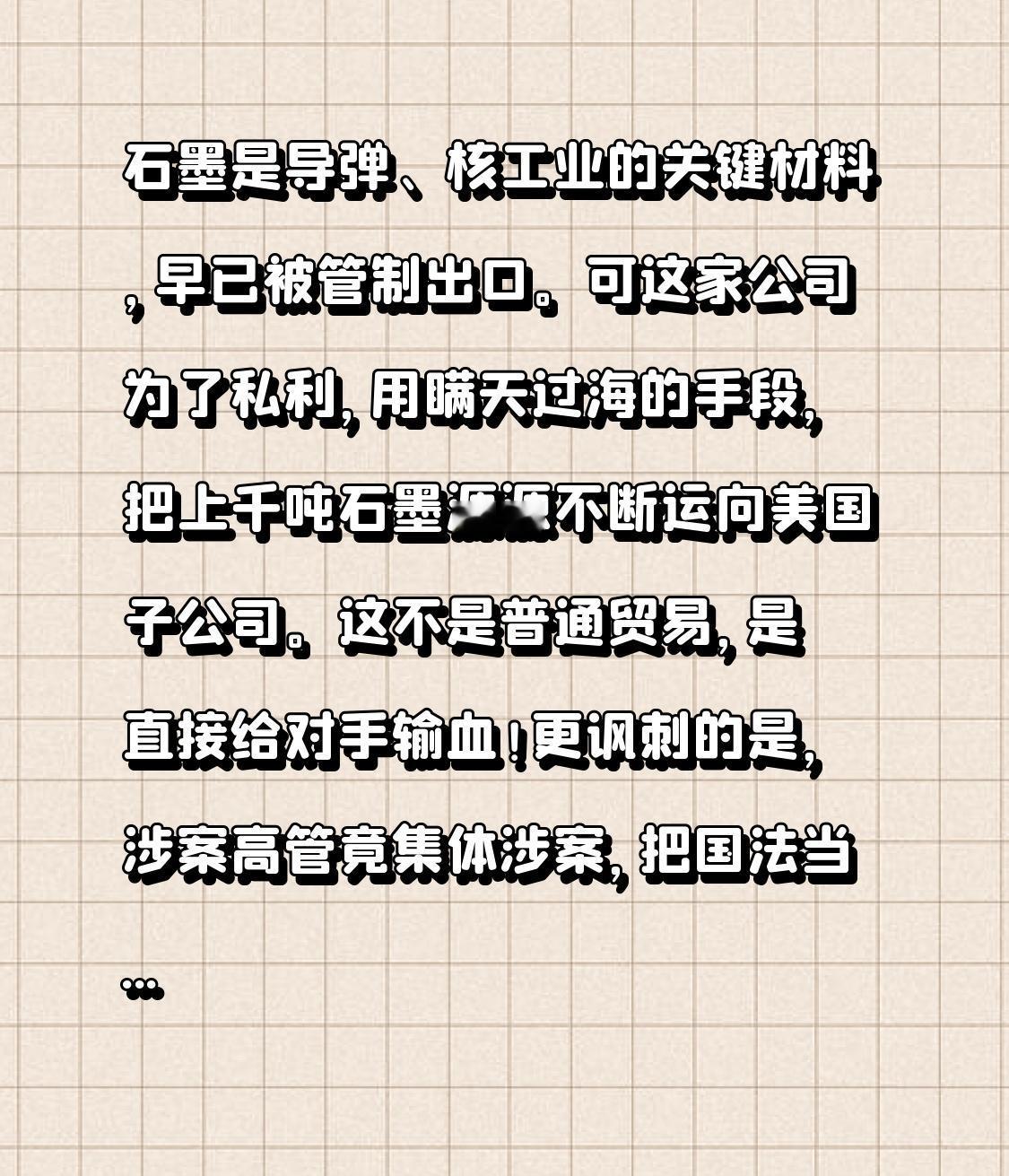 石墨是导弹、核工业的关键材料,早已被管制出口。可这家公司为了私利,用瞒天过海的手段,把上千吨石墨源源不断运向美国子公司。 这不是普通贸易,是直接给对手输血!更讽刺的是,涉案高管竟集体涉案,把国法当空气。如今他们被提起公诉,股价暴跌,也算是自食恶果。 你觉得这些人会被重判吗?评论区聊聊。 战略物资 石墨走私
