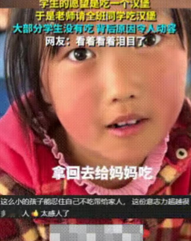 泪目!近日,河南一女老师和一个学生交流时,意外看到了这名学生的愿望,纸条上清晰地写着几个大字:“吃一个汉堡!” 河南一所乡镇小学,一个女老师把一张皱巴巴的纸条从纸篓里捡回来,对着上头的几个大字愣了半天,笔迹歪歪扭扭,铅笔描了又描:吃一个汉堡。 旁边还画了个麦穗包似的圆圈,大概算个面包,这不是城里孩子作文里普普通通的愿望,不是“我希望祖国繁荣富强”,也不是“我想开航母”,就是一个汉堡,一个在街边快餐店卖十几块钱的汉堡,在一个小姑娘心里,得郑重其事地写下来,像许愿一样交出去。 事情要从那个叫“心愿箱”的竹篓说起,这位女老师每个星期会从箱子里抽几张纸条,帮学生实现上面的愿望,在这个连个小卖部都找不全的乡镇上,孩子们的愿望小得让人心里发酸——有新字典就谢天谢地了,有人想给腰疼的奶奶买膏药,有人想要一支不会断铅的自动笔。 而这女孩的愿望,就是一张汉堡,老师没把这个纸条当寻常小事,她想了很久,没单独给这孩子买一个,反而咬咬牙,托人跑了几十公里去县城,直接扛回一整箱汉堡。 为什么要买一箱?当老师的人心里门儿清——单独发一个汉堡,这孩子就成了餐厅里那个端着托盘被人盯着瞧的异类,同学看她眼红,她自己也觉得自己特殊,全班人手一个,那就只是普通加餐,老师的用意无非是:别让这份善意变成包袱。 汉堡被送进教室那天,教室比过年还热闹,孩子们一个个眼睛瞪成铜铃,老师一个个地分,分到女孩的时候,却发现了不对劲——其他孩子要么立马啃上一口,要么凑在包装袋上使劲嗅那股焦香的面包味。 唯有这女孩,把汉堡端端正正地搁在课本上,手都不往上面搭,整个人坐着不动,眼睛盯着那个纸包裹的东西,没有一丝要撕开的意思。 老师弯腰问,是不是不饿,女孩低着头,手指攥着衣角拧了好几圈,声音小得像蚊子哼。 “我想带回家给我妈,她说她没吃过。” 教室里那些正吃得满嘴起酥渣的男生,手里的动作肉眼可见地慢了下来,有个孩子把手里的汉堡用纸重新包紧,塞回桌肚里。 老师站了好一会儿,转身走到黑板前,沉默地把眼眶里打转的东西硬憋回去,回过身,她把自己手上本想留作午饭的那份汉堡也塞给女孩,只说了一句:你现在吃这个,孩子咬下第一口,没什么太大声音,但眼泪掉进面包里的时候,谁也听得见。 那天老师统计发现,全班没几个人当场吃完,一大半汉堡被用纸包好,整整齐齐地放进书包,准备带回家给爷爷奶奶、弟弟妹妹,这哪是什么嘴馋的愿望,这不过是一群没见过多大世面的孩子,在自己仅有的好东西面前,第一个想到的不是自己。 事情后来传到了网上,评论区哭倒一片,好心人喊着要寄东西,捐汉堡的、捐钱的、捐书包的,恨不得把献爱的快递发一车皮,所有人都在等下转场——等着那封信,那场轰轰烈烈的感动中国式援助。 结果这位女老师把所有捐赠全退了,不接收,不转发,不抛账号,不搞捐款链接。 她说,东西你们拿回去,我一个人全挡了,不想让小孩子觉得因为可怜就有东西从天而降,不想让他们养成伸手的习惯,对乡村孩子来说最怕的不是穷,是穷怕之后养成的那股卑微,那种默认自己只能通过同情被施舍的心态。 今天他们因为可怜获赠一车汉堡,明天就可能习惯性地伸出双手,没有不可抗拒的感动,只有一盏普普通通的灯,和一个不是起高楼而是扶着他们站直的人。 故事的最后,汉堡大概早就被吃进肚子消化完了,但这个女孩,和她的那些同学,可能这辈子都记得,曾经有一位老师没有把他们的愿望拿去换取掌声和物资,而是用一种并不花哨的方式,告诉他们:不是每一次得到都因为可怜,不是每一个帮助都要你弯腰。 这也许比十个汉堡、一百箱慰问品,都更值得带走。 来源:网易新闻