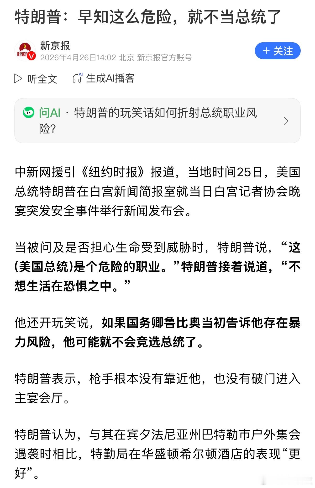特朗普说早知这么危险就不当总统了虚伪,得了便宜卖乖是也。如果凭良知当总统危险基本上会小很多,不过懂王的中期选举基本没了,也不用急,等被弹劾后再说这句话也不晚。