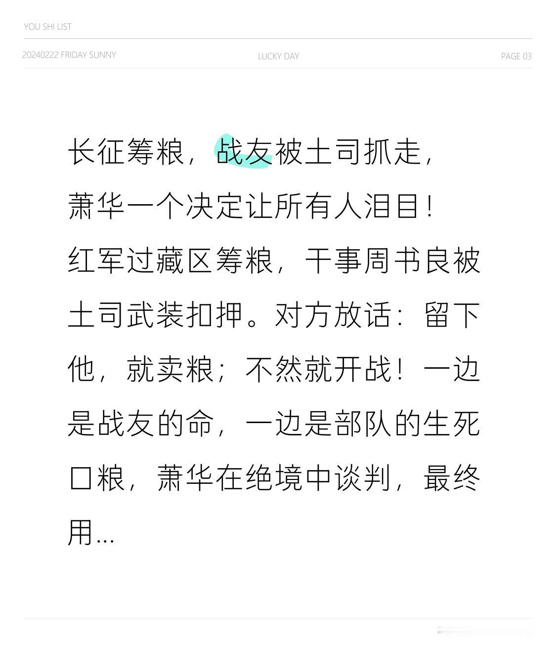 长征筹粮,战友被土司抓走,萧华一个决定让所有人泪目! 红军过藏区筹粮,干事周书良被土司武装扣押。对方放话:留下他,就卖粮;不然就开战! 一边是战友的命,一边是部队的生死口粮,萧华在绝境中谈判,最终用自己的担当,既保住了队伍,也守住了人性。 如今再看这段历史,你最敬佩萧华的哪一点? 长征故事 萧华 红色记忆