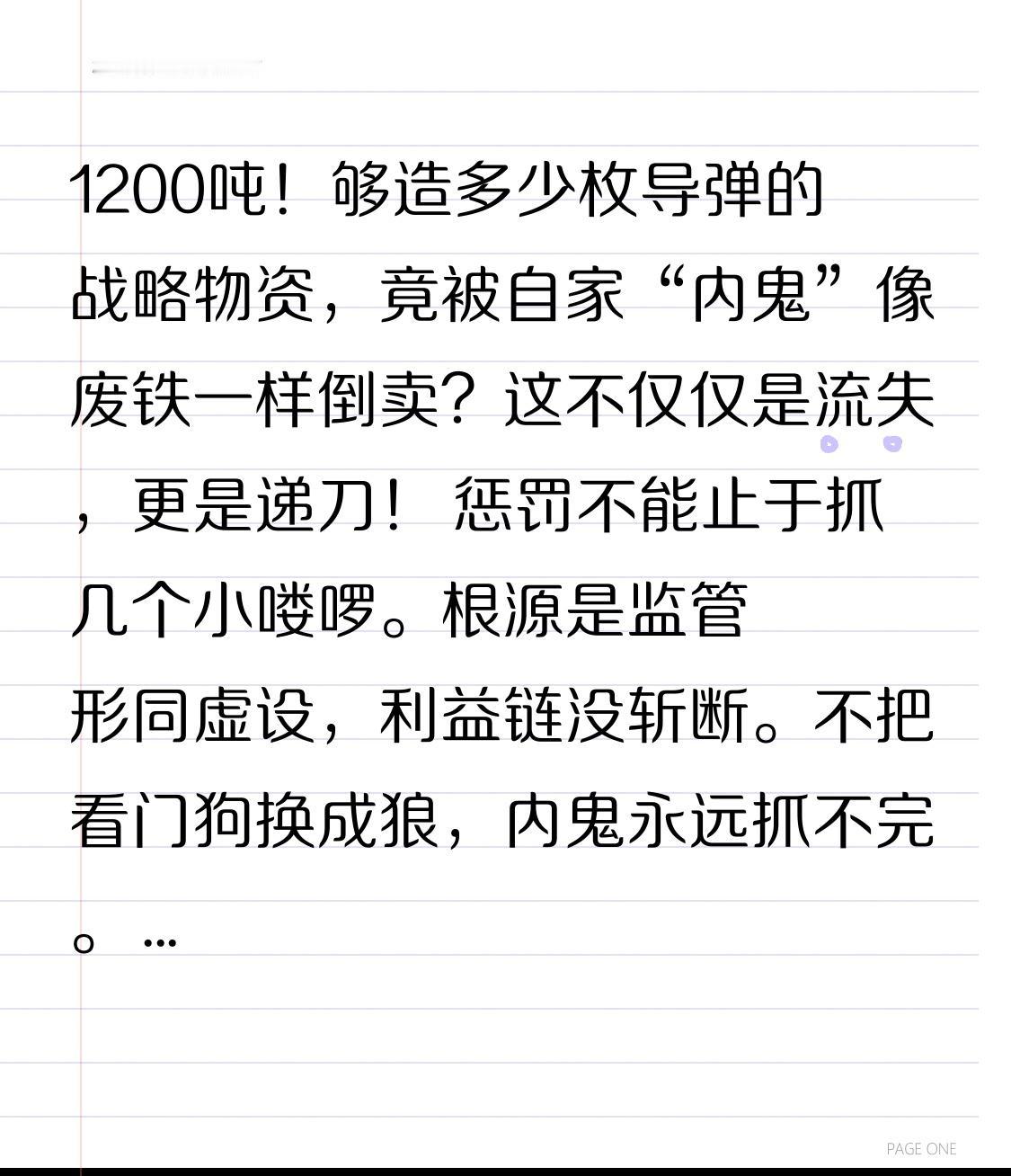 1200吨!够造多少枚导弹的战略物资,竟被自家“内鬼”像废铁一样倒卖?这不仅仅是流失,更是递刀! 惩罚不能止于抓几个小喽啰。根源是监管形同虚设,利益链没斩断。不把看门狗换成狼,内鬼永远抓不完。 你觉得该不该恢复“投机倒把罪”重判?评论区见。 国家安全 内鬼 战略物资