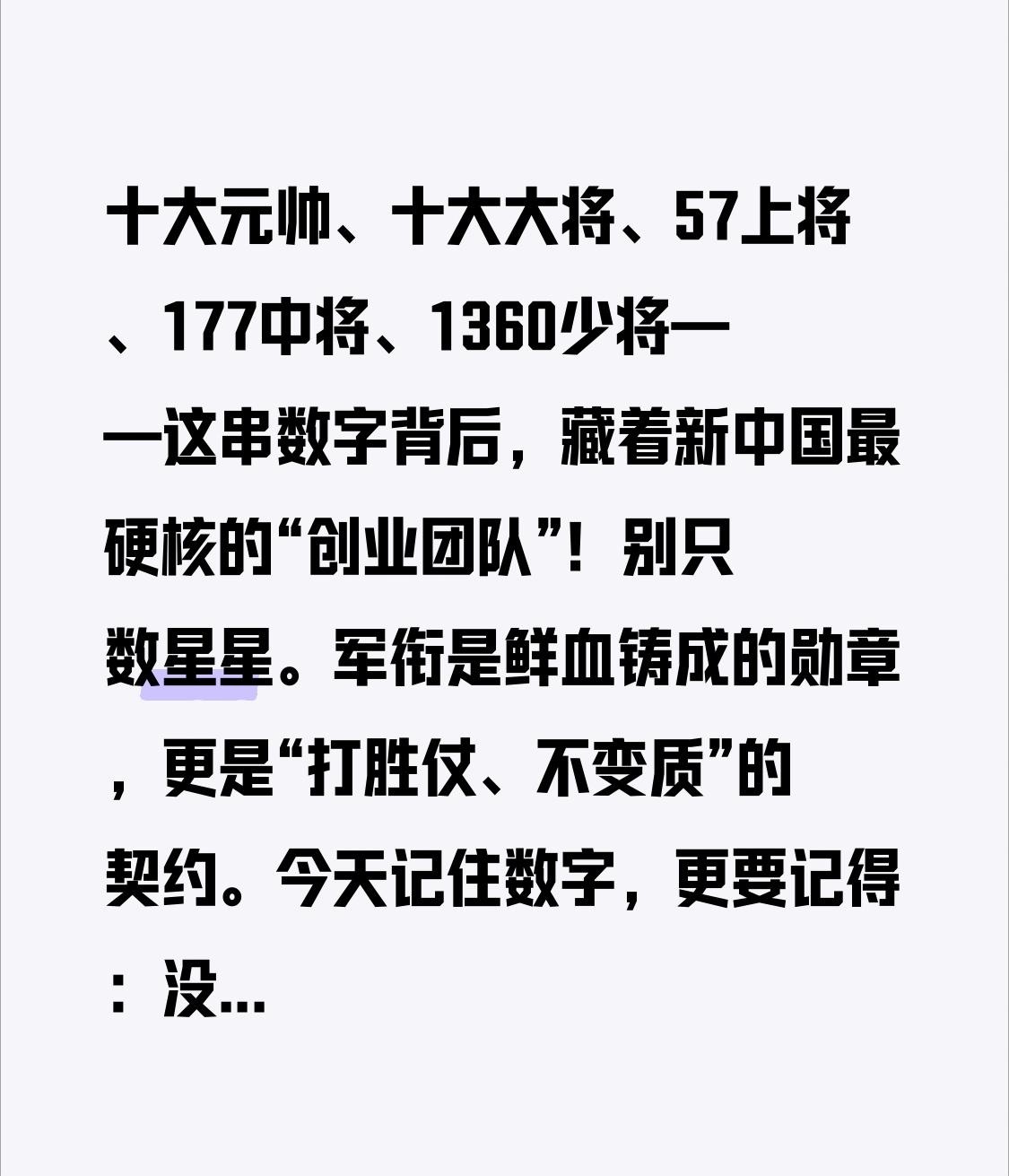 十大元帅、十大大将、57上将、177中将、1360少将——这串数字背后,藏着新中国最硬核的“创业团队”! 别只数星星。军衔是鲜血铸成的勋章,更是“打胜仗、不变质”的契约。今天记住数字,更要记得:没有他们,哪有我们躺平刷手机的资格? 你心中最能打的开国将帅是谁?来唠唠。 开国将帅 军衔制 历史致敬