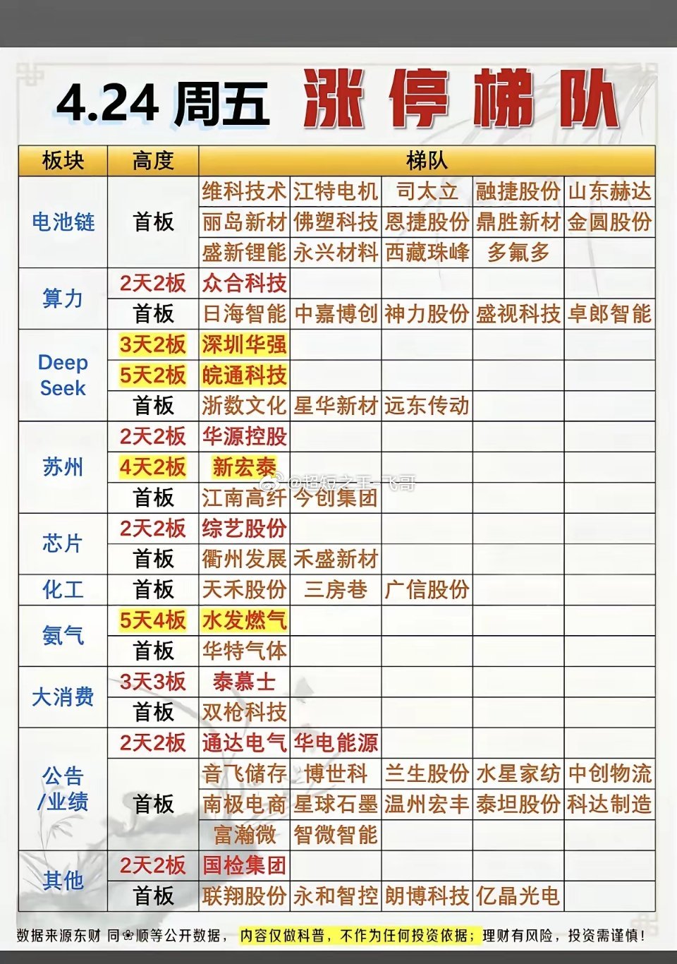 4.26周日 周五涨停板股票:题材高度!电池链 14股涨停算力租赁 5股涨停Deepseek 5股涨停苏州板块 4股涨停芯片产业链 3股涨停化工原料 3股涨停
