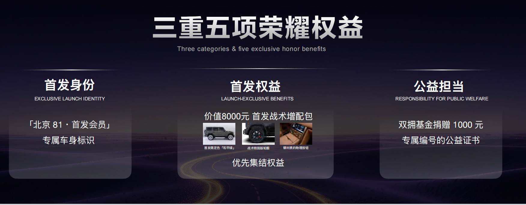 预售权益简单总结:下单有购车抵扣、装备二选一,还有免费全域越野救援+全国63家站点全年养护保障,玩越野的确实省心。