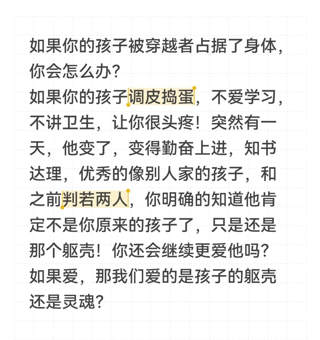 首先必须得明确的知道是被夺舍了,不然所有家长都会觉得是自己孩子开窍了,长大懂事了