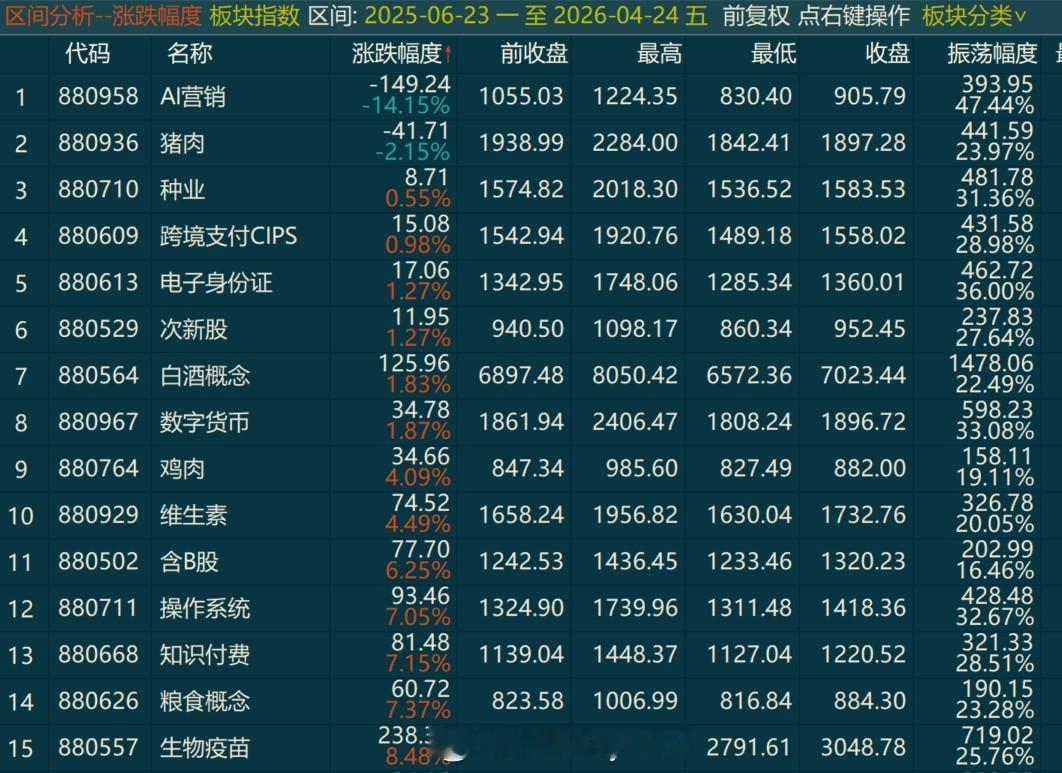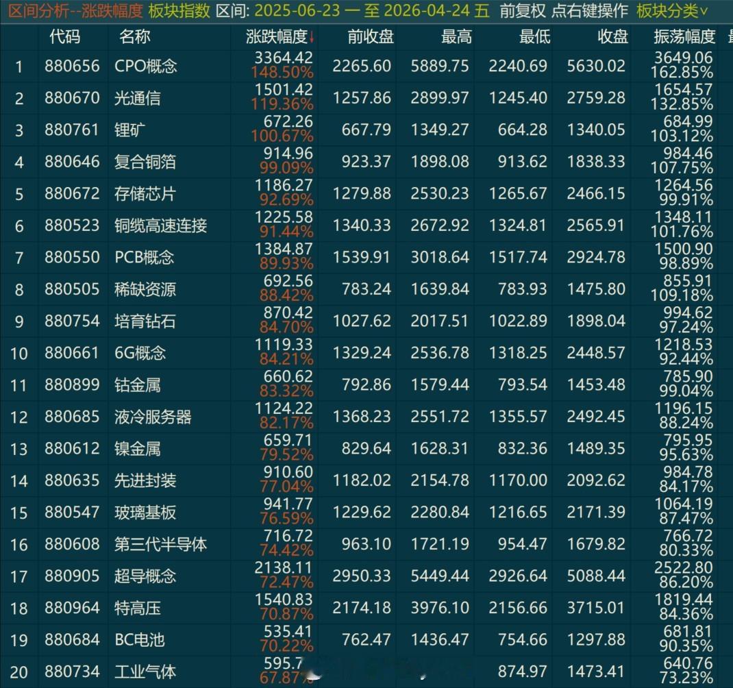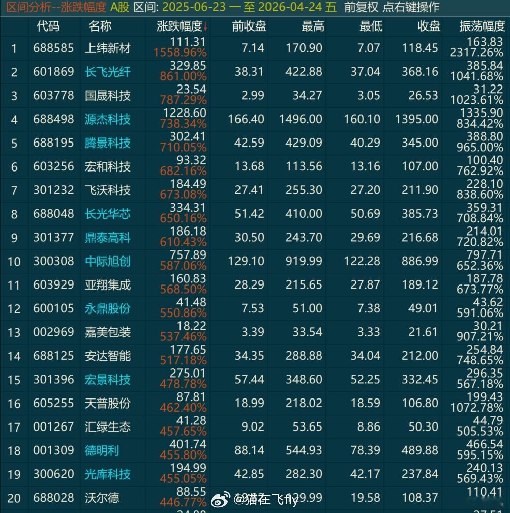 从2025年6月23日三根大阳线突破开启牛市后。。CPO指数涨了148.5%,光通信涨了119.36%都是板块指数翻倍的走势同样是这差不多1年的时间跌幅榜上是哪些老登板块。。最具代表的就是大家熟悉的白酒了。。板块涨幅1.83%---------------刚说的是板块,具体到个股,这差不多1年的时间翻倍的个股也非常多而且。。抛开那连续大涨的题材个股不说反倒是这些趋势票是咱大部分普通投资者可能能拿住的一个扎心的事咱最熟悉的易中天在去年今天的价格分别是中际旭创82.62,新易盛64.91,天孚50.93今天的价格是中际旭创886.99,新易盛537.27,天孚323.87------1年10倍的龙头已达成-------也反省了好久努力本身很重要努力的方向更重要