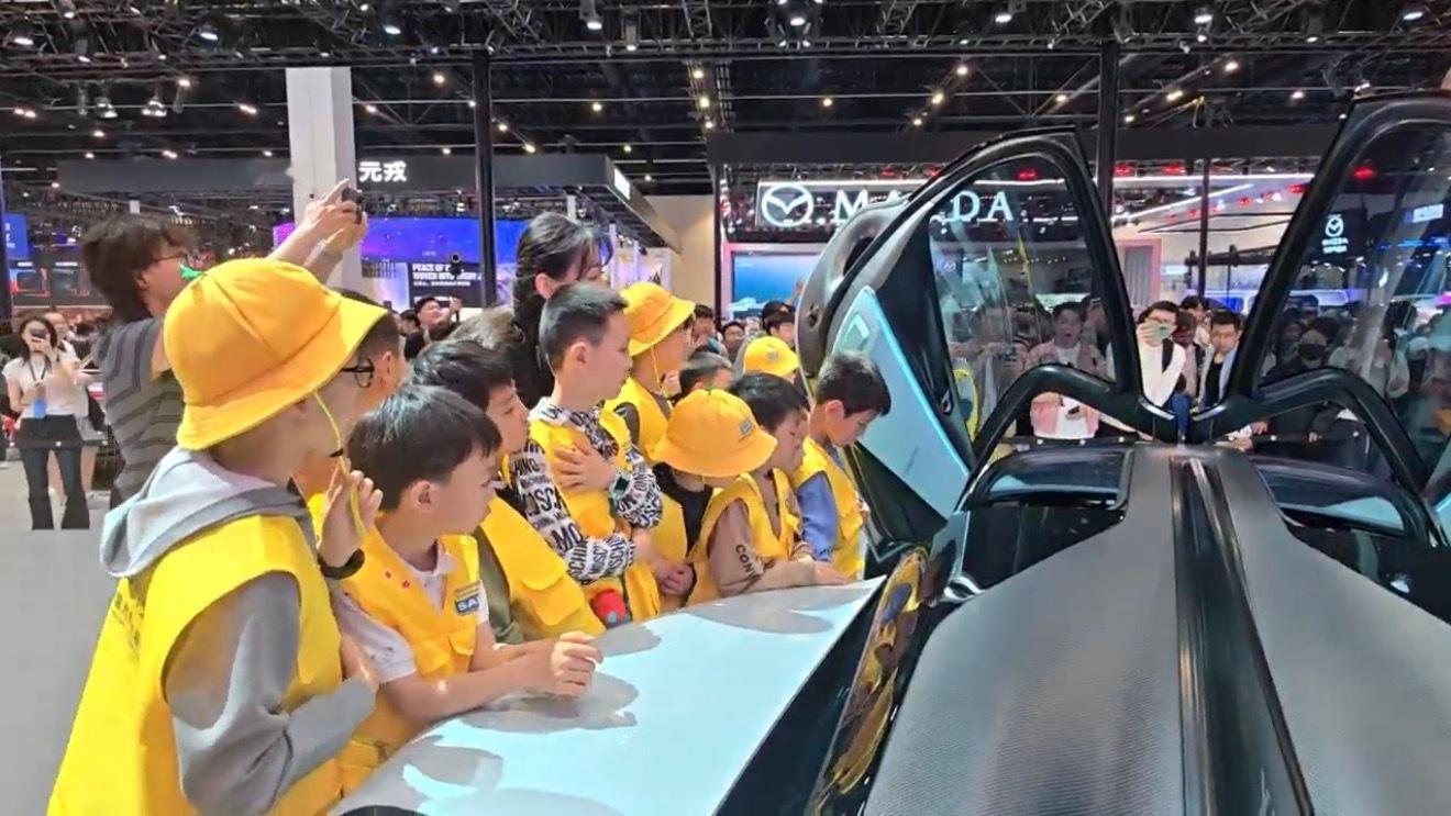 小米展位成小学生研学现场车展顶流再破圈!快看小米展台迎来了哪位“重量级”嘉宾?小学生们组团来打卡研学啦!