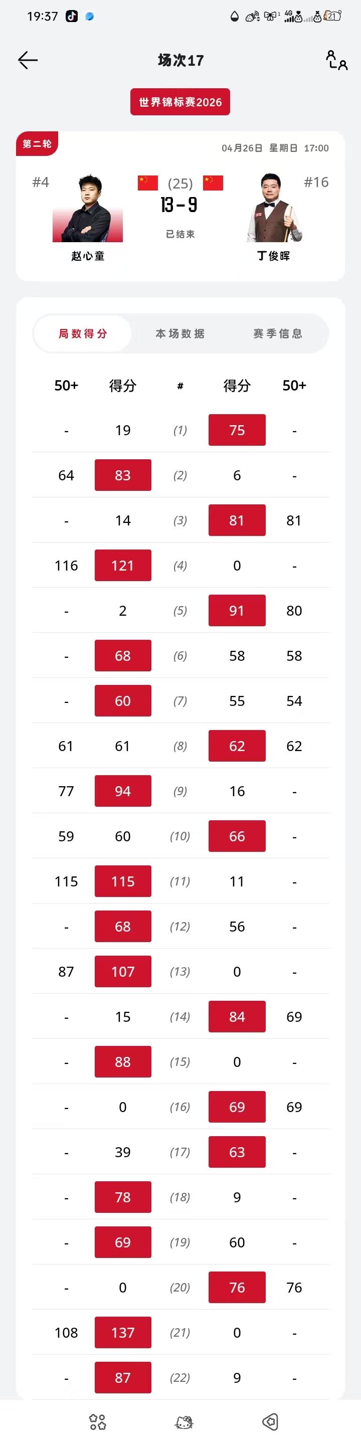 赵心童13-9击败丁俊晖,进入世锦赛八强,下一轮迎战大嘴墨菲。 本场比赛赵心童打出3杆过百,本赛季过百打到80杆。赵心童长台命中率接近7成,是他得分利器,围球也还不错,进攻成功率达到93%。丁俊晖则受困于长台,命中率只有4成,围球也经常中断。比赛过程中,一颗红球,丁俊晖趴下去几次。不停揉眼睛,不知道是不是长时间的比赛,眼睛不适。 丁俊晖结束了本赛季,本赛季胜率为57.14%,是近18年来最低的一次。晖哥还得加油! 下一轮赵心童将迎战墨菲,墨菲是一个以进攻为主的球员,双方比赛应该好看。