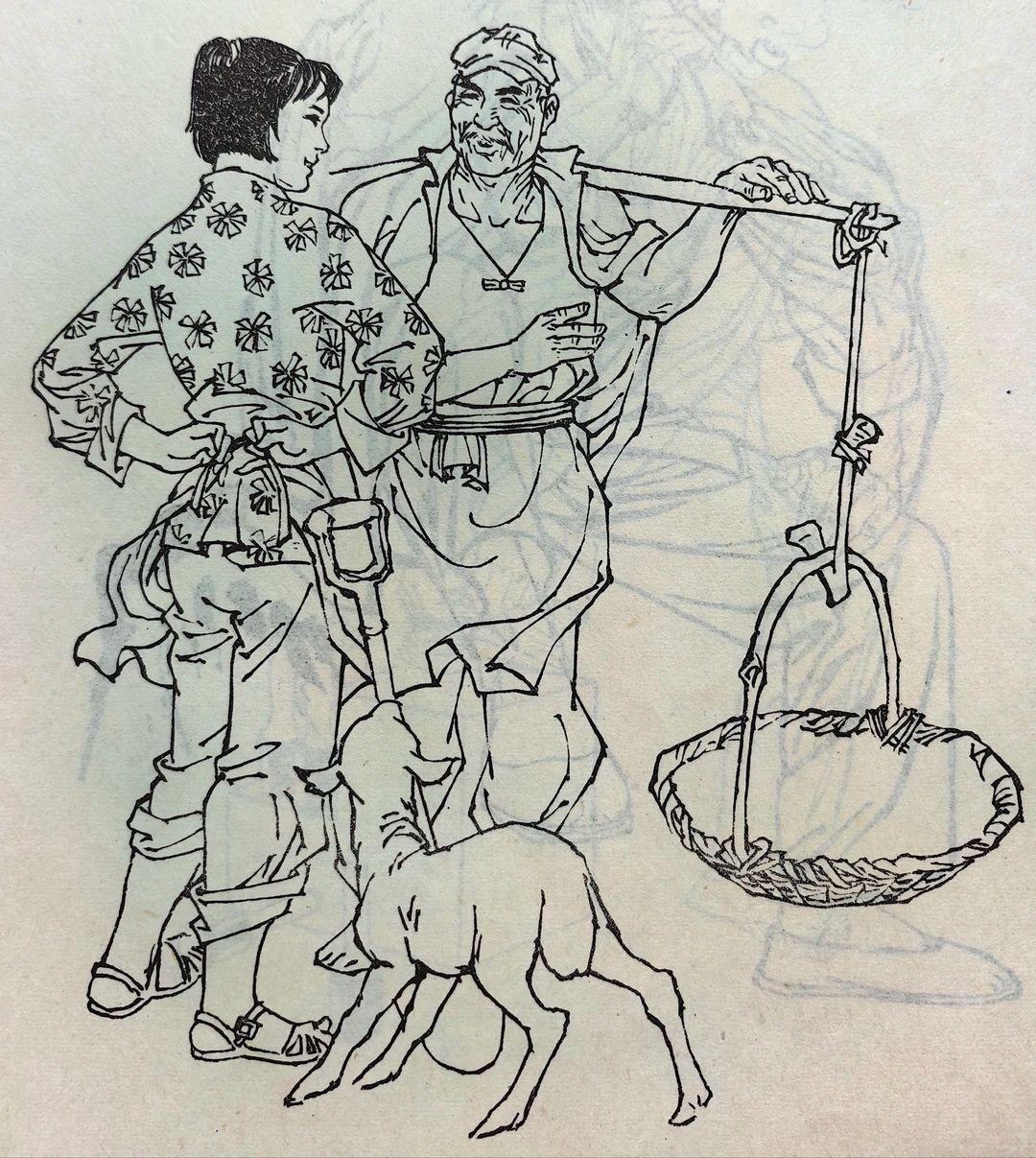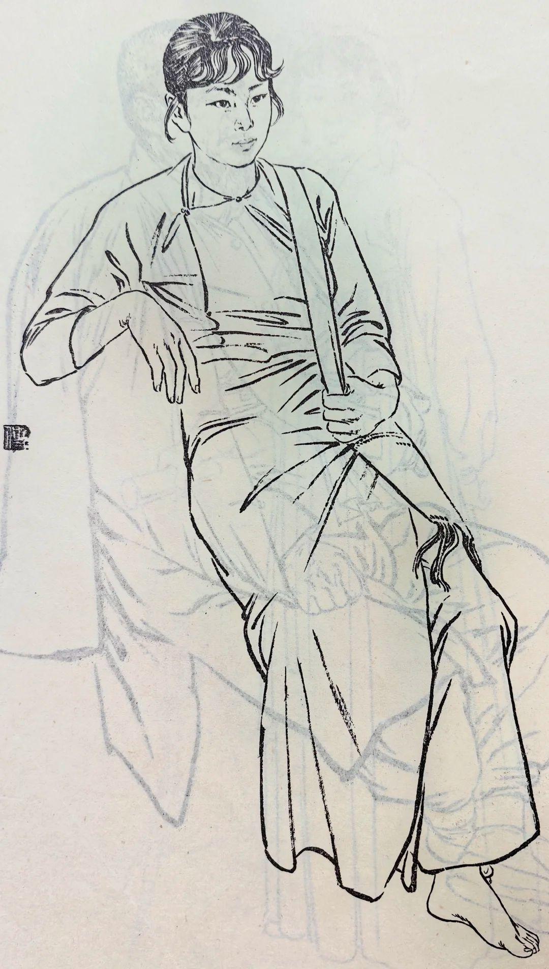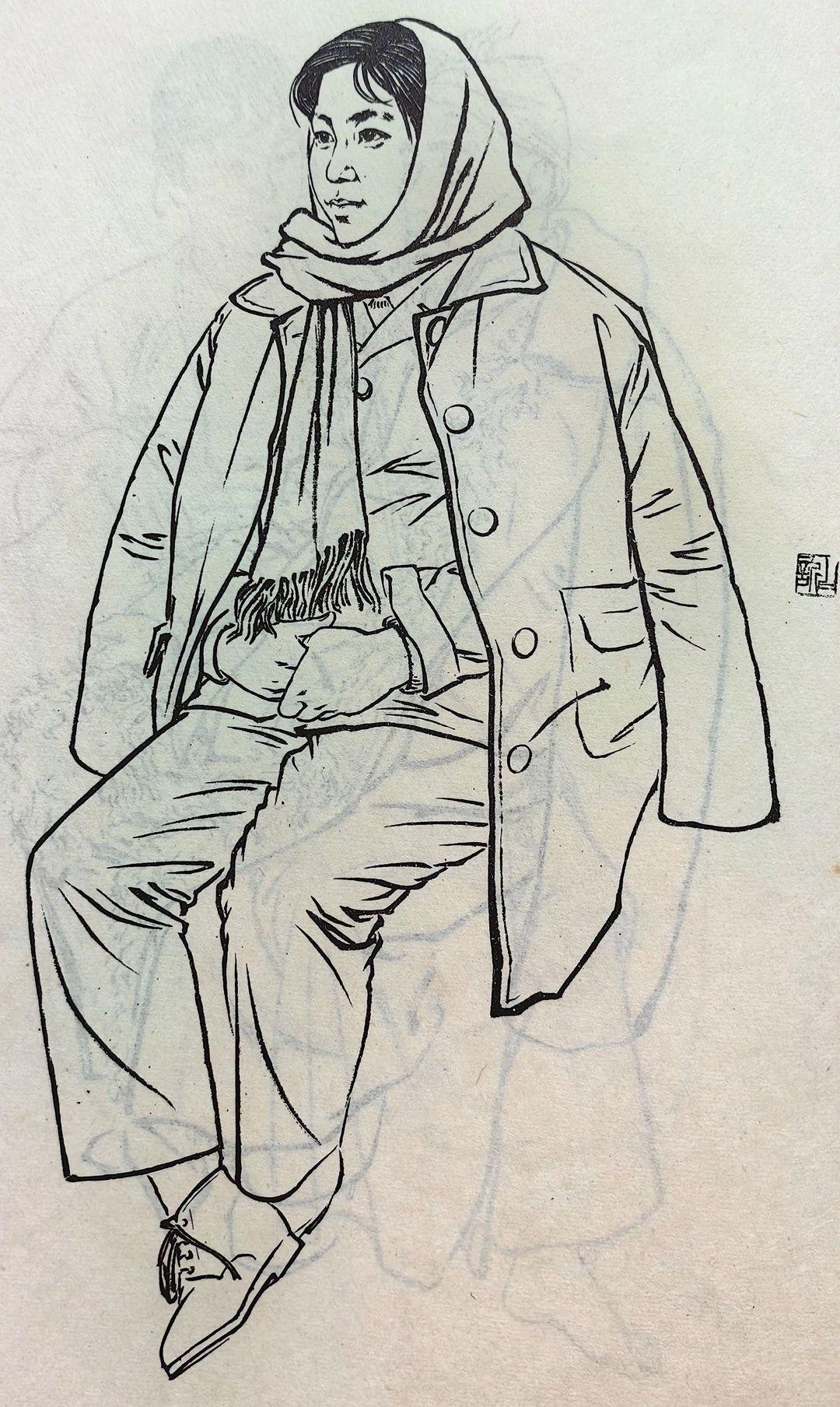 一组七八十年代的白描人物,线条洗练精准,干净利落的铁线描勾勒形象,线条轻重顿挫间,准确表现了不同人物的动态、服饰质感与神情气质,形象鲜活生动,神态各异却都传递出朴素真切的生活气息。 这些老的人物素描作品,不仅体现出线描“骨法用笔”的传统魅力,也把现实主义的生活观察融入其中,造型严谨又不失灵动,既有教学示范价值又有艺术感染力,是非常优秀的线描作品。 最后一幅,是不是有点头大身子小?