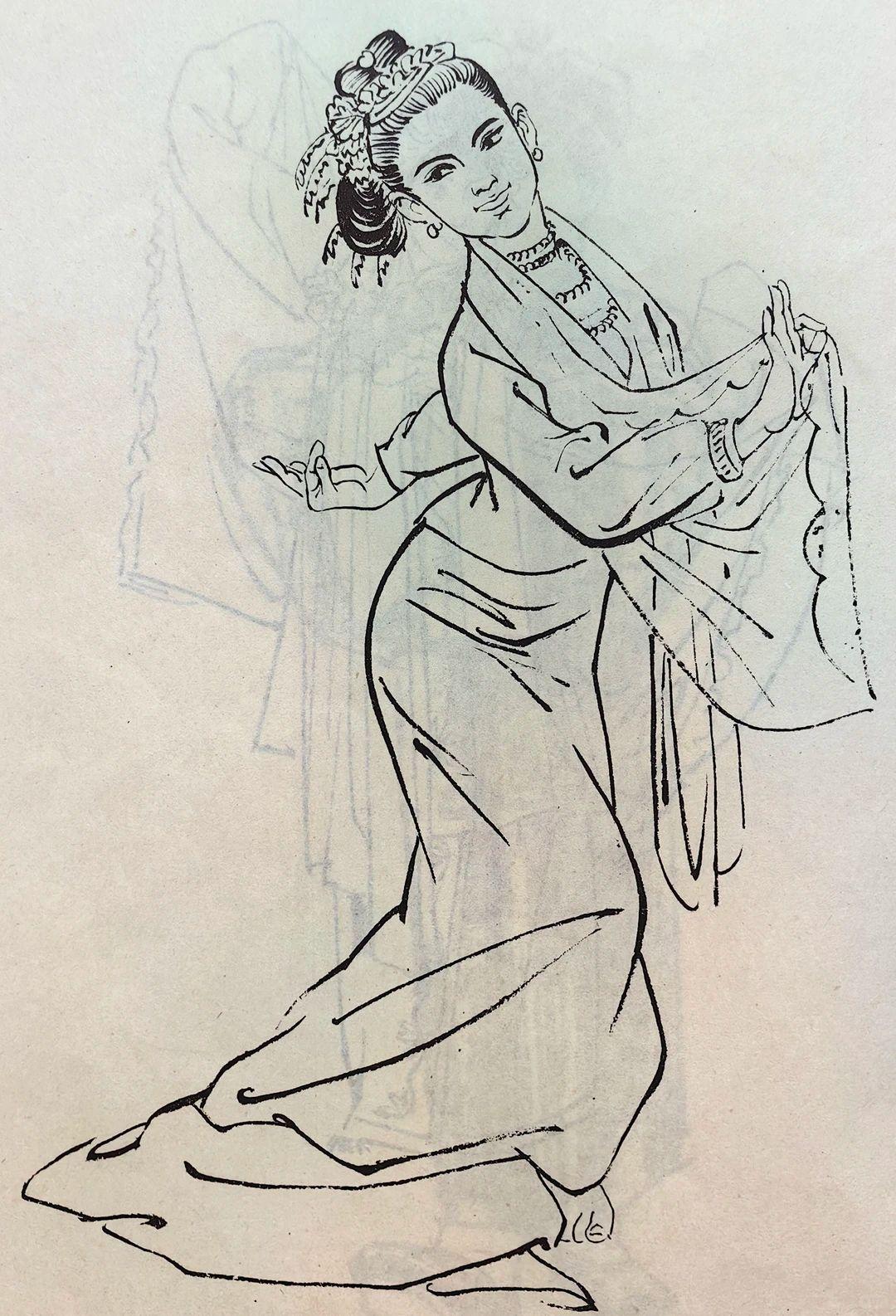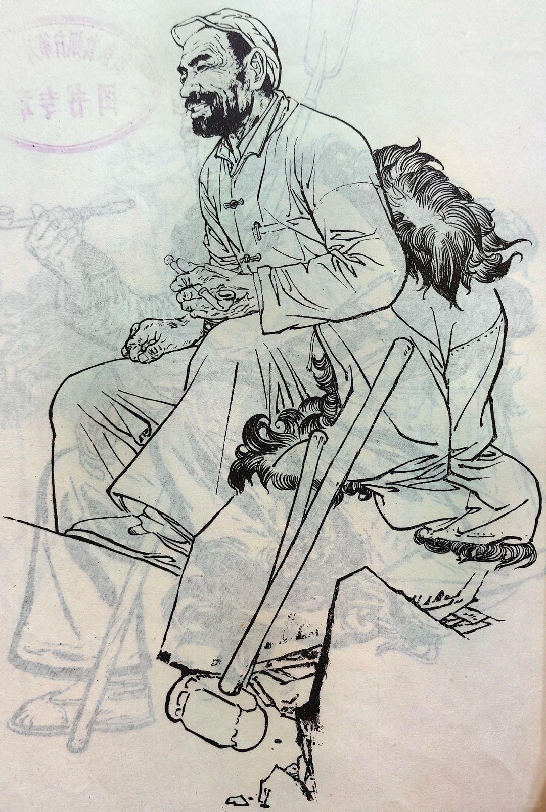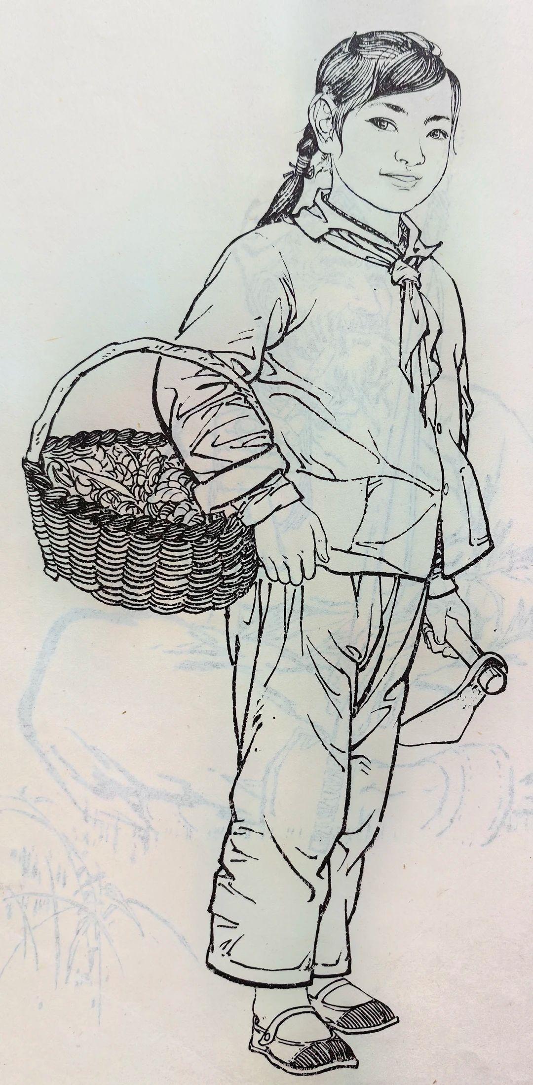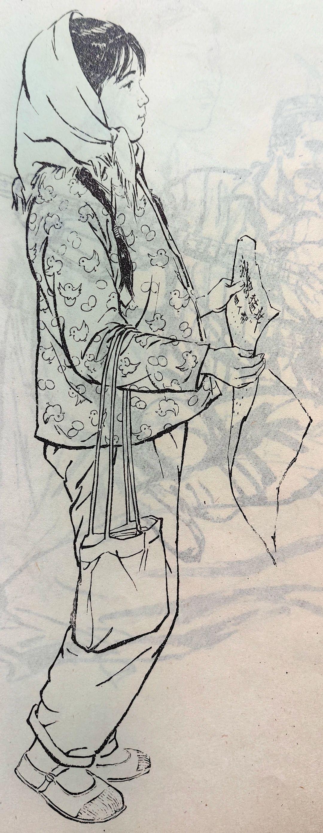 一组七八十年代的白描人物,线条洗练精准,干净利落的铁线描勾勒形象,线条轻重顿挫间,准确表现了不同人物的动态、服饰质感与神情气质,形象鲜活生动,神态各异却都传递出朴素真切的生活气息。 这些老的人物素描作品,不仅体现出线描“骨法用笔”的传统魅力,也把现实主义的生活观察融入其中,造型严谨又不失灵动,既有教学示范价值又有艺术感染力,是非常优秀的线描作品。 最后一幅,是不是有点头大身子小?