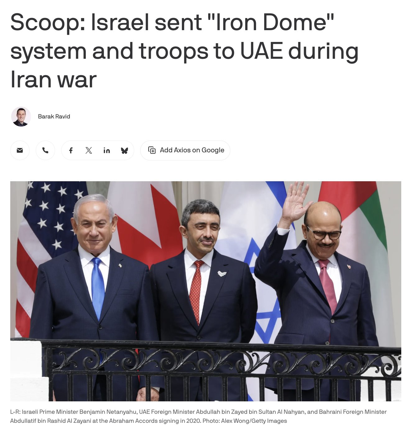🔻Axios 又来了:“以色列在伊朗战争期间秘密向阿联酋部署了其铁穹系统和部队——这是该系统首次在海外使用。”伊朗提出新条件特朗普紧急撤离时摔倒海外新鲜事中东现场直击