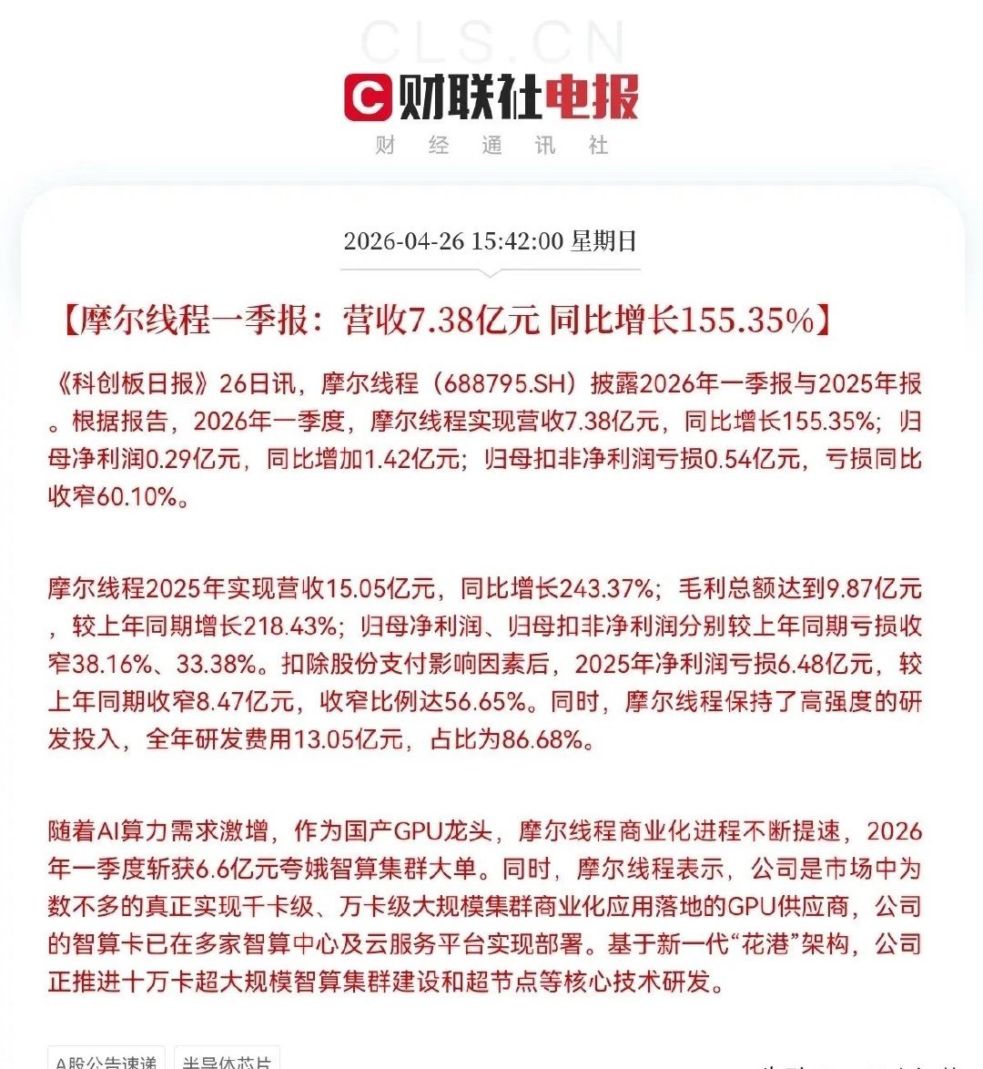 突发利好消息!大利好哇,大爆发了,满仓这个方向的,明天股民们都要把歌唱了下午4点时分,中国版英伟达摩尔线程正式发布了2025年及2026年一季度业绩报告,2025年营收15.06亿,同比增长243.37%,归母净利润亏损10亿,比去年少亏6亿,同比增长38.16%,2026年一季度,营收7.38亿,同比增长155.35%,归母净利润2935.92万,扭亏为盈,同比增长126.1%,积极的信号来了,利润终于转正了,开始要赚钱了,又是大增,利润预计要开始释放了,要大幅飙升,太给力了,此前市场普遍预期2027年才整体盈利,现在拐点明显提前了,超出了预期,加上公司订单量充足,AI算力源源不断释放产能,未来业绩确定性越来越高,国产GPU龙头实至名归持仓的股民们,坐稳稳扶好了,预计要跳空高走了吧,准备要继续吃大肉了…