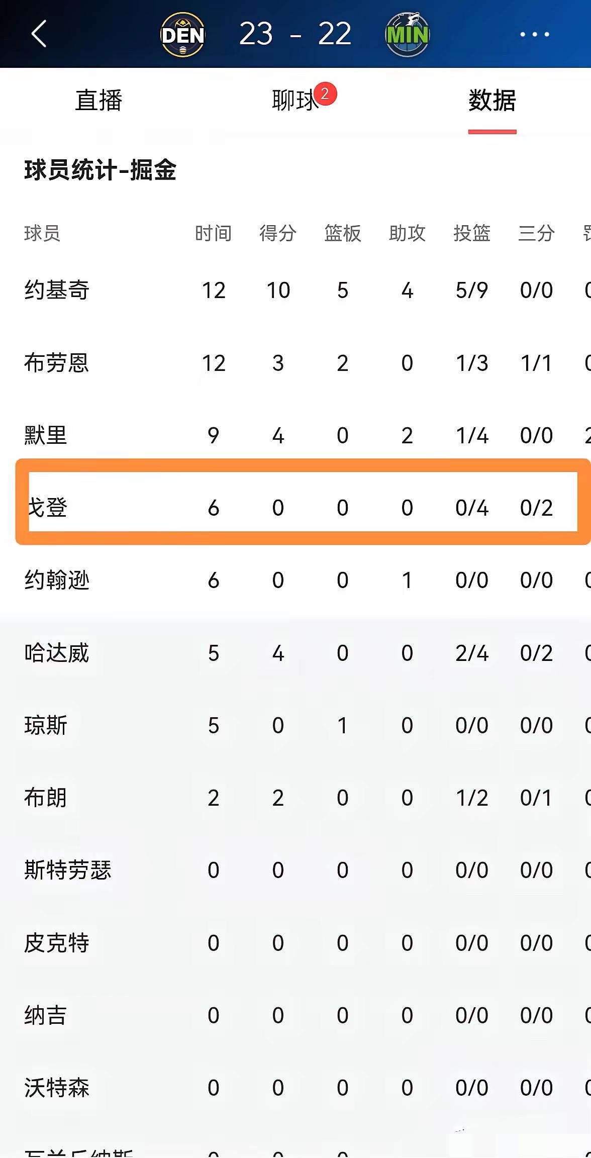 掘金绝对后悔让阿隆-戈登复出了!在今天掘金客场挑战森林狼的季后赛首轮G4中,目前双方的第一节比赛已经结束,虽然掘金以23:22处于领先,但是本场比赛复出的戈登却表现低迷 首节6分钟,戈登4投0中,0分0篮板0助攻,正负值-1,完全不像那个能攻能防的锋线大闸。谁都知道他是带小腿伤复出,可这状态,别说帮球队,反倒拖了全队后腿。 本来掘金指望他回来锁爱德华兹、冲抢篮板、空切吃饼,补上G3输球的最大漏洞。结果他上场后不敢跑不敢跳,防守端横移慢半拍,被森林狼球员轻松过掉;进攻端空位不敢投,接球就慌,完全找不到节奏。教练把他按在场上,就是想靠他的存在撑一下防守体系,可效果比缺阵时还糟。 全场打完,掘金96-112惨败,大比分1-3落后,基本走到悬崖边。戈登全场只拿9分1篮板,作为首发前锋,篮板球比后卫还少。球迷都看懵了,这哪是救火,分明是火上浇油。 不少网友直接吐槽:“带伤上阵精神可嘉,但实力不允许,不如不上”“掘金赌错了,戈登现在就是负作用”“与其让他硬撑,不如信任年轻球员”。也有球迷心疼,说他是想帮球队才咬牙上,奈何身体不允许,越打越急越乱。 马龙赛后也承认,戈登带伤出战,攻防都受很大影响。掘金现在进退两难:G5不让他上,防守更没保障;让他上,又怕继续低迷。这次仓促复出,不仅没救成比赛,反倒让球队陷入更被动的局面,也让戈登自己冒着加重伤病的风险。斯诺克精神探讨 18年火箭和21年篮网谁更厉害? 负债100万了,现在最该干什么 18年火箭和21年篮网谁更厉害? 负债100万了,现在最该干什么 如何才能提高自己的写作水平 如何才能提高自己的写作水平 如何才能提高自己的写作水平 如何才能提升自己的写作能力? 如何才能提升自己的写作能力? 如何才能提升自己的写作能力? 斯诺克世锦赛的现状如何 斯诺克世锦赛的现状如何 斯诺克世锦赛的现状如何 季后赛每一步都赌上赛季命运,你觉得掘金当初该不该让戈登带伤复出?G5到底该不该再派他上场?