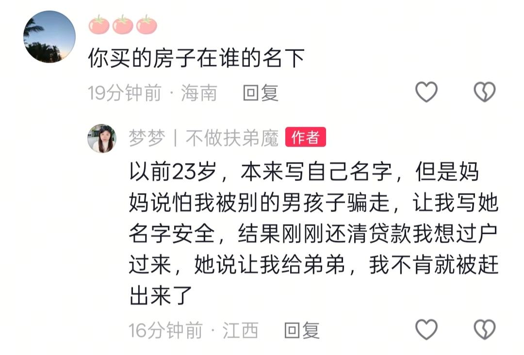 刷到江西一个女孩说,23岁时候买了自己赚钱买的房子,妈妈说怕她被别的男孩子骗走,所以放在了妈妈名下。房贷还清后女孩想过户,妈妈说要留给弟弟。家里所有亲戚都劝她给弟弟,只有外公站在她这边,希望女儿能把房子给女孩,称不过户就不要来往了,不知道说的是妈妈不要跟外公来往?还是女孩不要跟妈妈来往? 看到这样的消息真的很愤怒!现在社会为何有些家庭还要把女孩当成娘家的敛财工具? 一个男孩子,本来就要有能力赚钱养家糊口的,却想把姐姐的私有财产据为己有。大概觉得,自己是男孩,是女孩娘家的后盾,才这样肆无忌惮吧! 但说实话,一个无限压榨女孩的家庭,娘家从来就不会是她们的后盾,只会成为债主。不知道这个女孩能不能要回属于自己的房子?