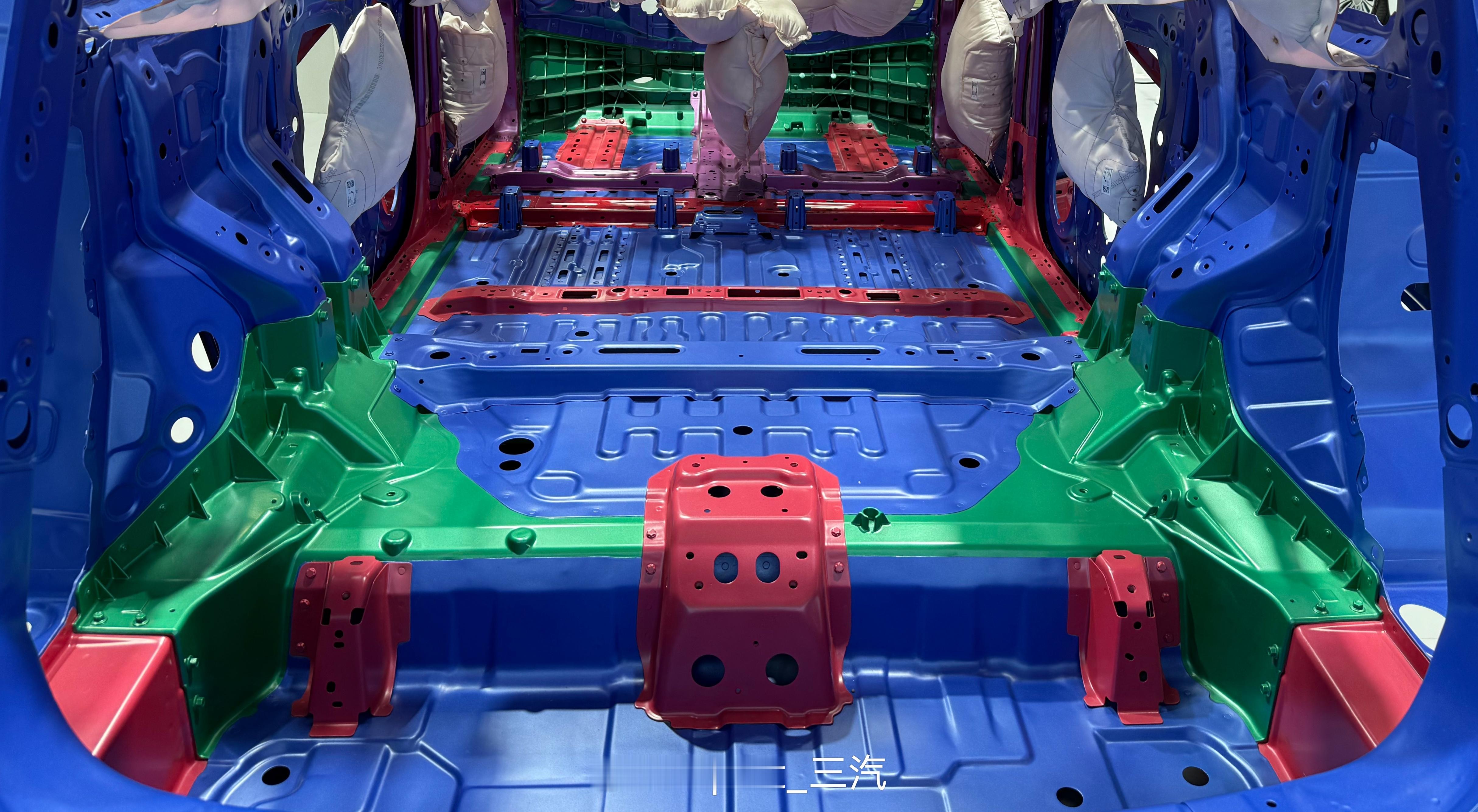 这两台车,一个X9一个D19为了扩大尾坑面积也是拼了、后纵梁外扩,没有在水平方向完全对准后硬点,铸件需要稍微拐点弯对结构效率的补救,小鹏是用加个斜支撑;零跑是多补三个钢冲压件(红色)