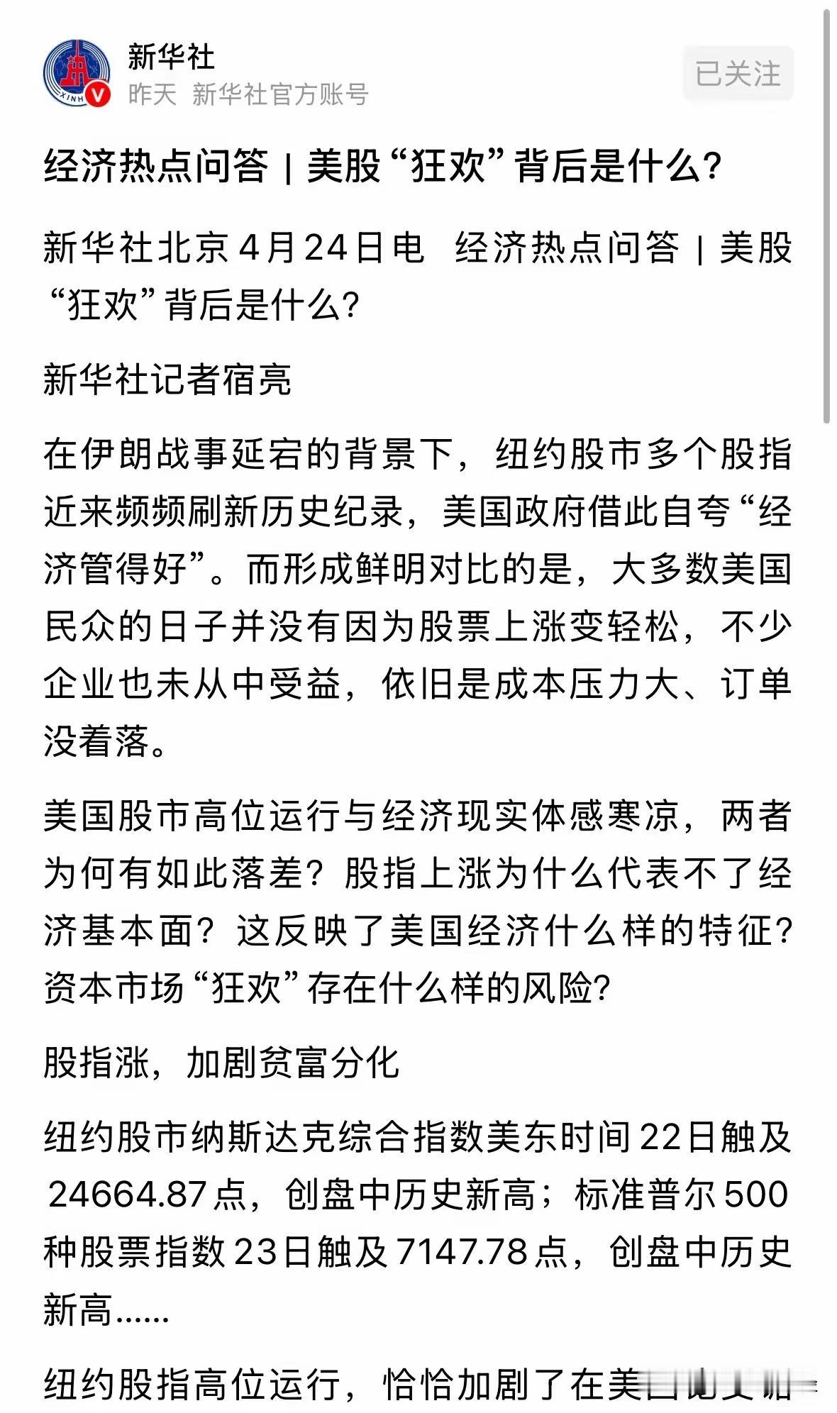 纽约股市纳斯达克综合指数美东时间22日触及24664.87点,创盘中历史新高;标准普尔500种股票指数23日触及7147.78点,创盘中历史新高……。 怎么看待纽约股市多个股指近来频频刷新历史纪录呢? 一.股指涨,加剧贫富分化,纽约股指高位运行,恰恰加剧了在美国饱受诟病的贫富分化问题(新华社4月24日)。 二.美国政府常以股指上涨为经济表现背书,但股指并非经济的“晴雨表”,尤其在当前美国经济结构下,股指上涨与经济基本面脱节已是常态(新华社4月24日)。 三.狂欢背后,暗藏多重风险,一旦出现风吹草动,市场情绪可能迅速逆转,引发剧烈波动(新华社4月24日)。 可见,美国股市大涨并不能真实的反映美国的整体经济面,反而暗藏着诸多不利经济发展的因素和风险。
