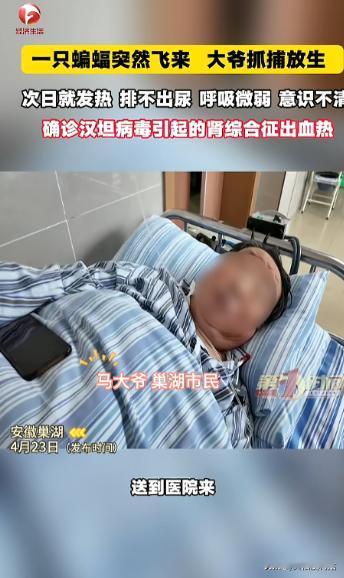 “悲剧还是发生了!”近日,安徽巢湖,一位大爷发现家中进了只蝙蝠,他伸手就去抓,可蝙蝠直接冲向了他的面部。大爷在那儿碎碎念,我放你生,你不要害我。可没想到第二天大爷就病了,被送去医院抢救!网友:徒手,怎么敢的呢? 这件真实惊险的事情发生在2026年4月,4月23日,巢湖当地医院里,71岁的马大爷刚刚从ICU转危为安,艰难从鬼门关捡回一条命,谁都难以想象,差点夺走老人生命的,仅仅是一只误入家中的蝙蝠和一次毫无防护的善意。 时间回到4月7日深夜,夜深人静,马大爷和老伴早已入睡,深夜的卧室格外安静,一阵细碎的沙沙声突然打破寂静,惊醒了熟睡的老两口,两人起身查看,发现窗帘缝隙里藏着一只误入室内的蝙蝠。 马大爷目睹被困的小生命,心生善念,既未驱赶也未伤害,打算徒手抓了开窗放生。他未做防护,没戴手套口罩,伸手靠近蝙蝠。受惊吓的蝙蝠应激,猛地朝他脸部扑来。 狭小的卧室之中,老人和野生蝙蝠近距离拉扯对峙,裸露的皮肤,面部黏膜直接接触到蝙蝠的翅膀,爪子和分泌物,慌乱间,马大爷费了好大劲才把蝙蝠装入袋中。他急忙推开窗户将其放生,嘴里不停念叨着,愿放它生路,只求自身免遭伤害。 彼时的马大爷满心以为自己做了一件善事,圆满解决了小事,平安无事,可他根本不知道,危险早已悄然潜伏,放生当晚,他的胸口和后背就开始发红发烫,身体出现轻微不适,老人只以为是普通皮肤湿疹,完全没有放在心上,更没有前往医院检查诊治。 很多人都不知道,蝙蝠是自带大量病毒、细菌和寄生虫的野生生物,哪怕没有明显的抓痕,没有出血,只要皮肤黏膜接触到它的唾液,皮毛分泌物,病毒就可能侵入人体,并且存在一定潜伏期,初期几乎毫无明显痛感极其容易被人忽视。 仅仅相隔一天危险彻底爆发,第二天中午,马大爷身体骤然垮掉,突发高烧浑身酸软无力,连站立都十分困难,最致命的是出现无法排尿的症状,家人察觉情况不对,瞬间慌了神,急忙将他紧急送往医院抢救。 入院时,马大爷已经意识模糊呼吸微弱,生命体征极其不稳定,医生结合他接触野生蝙蝠的经历和身体症状,快速确诊为肾综合征出血热,这种病症极其凶险,病毒会持续攻击人体血管与肾脏,导致全身中毒,体内钾离子飙升,一旦错过救治时机随时会引发心脏骤停。 据医生介绍,马大爷能够成功获救,完全是家人送医及时,若是再耽误几小时后果不堪设想,事件曝光后,瞬间引发全网热议,大家纷纷感慨,老人心存善良却忽略了野生动物的危险性,善意从来抵不过病毒,面对野生生物,心存敬畏远比心软更重要。 此事亦提醒众人,若家中闯入蝙蝠,切勿徒手抓捕或近距离接触。可借助纸箱、扫帚等工具隔离驱赶,事后还需及时进行消毒处理,以保安全。一旦不慎接触务必第一时间就医检查,切勿心存侥幸,永远记住善良要有底线,更要有防护,敬畏自然,才是保护自己最好的方式。