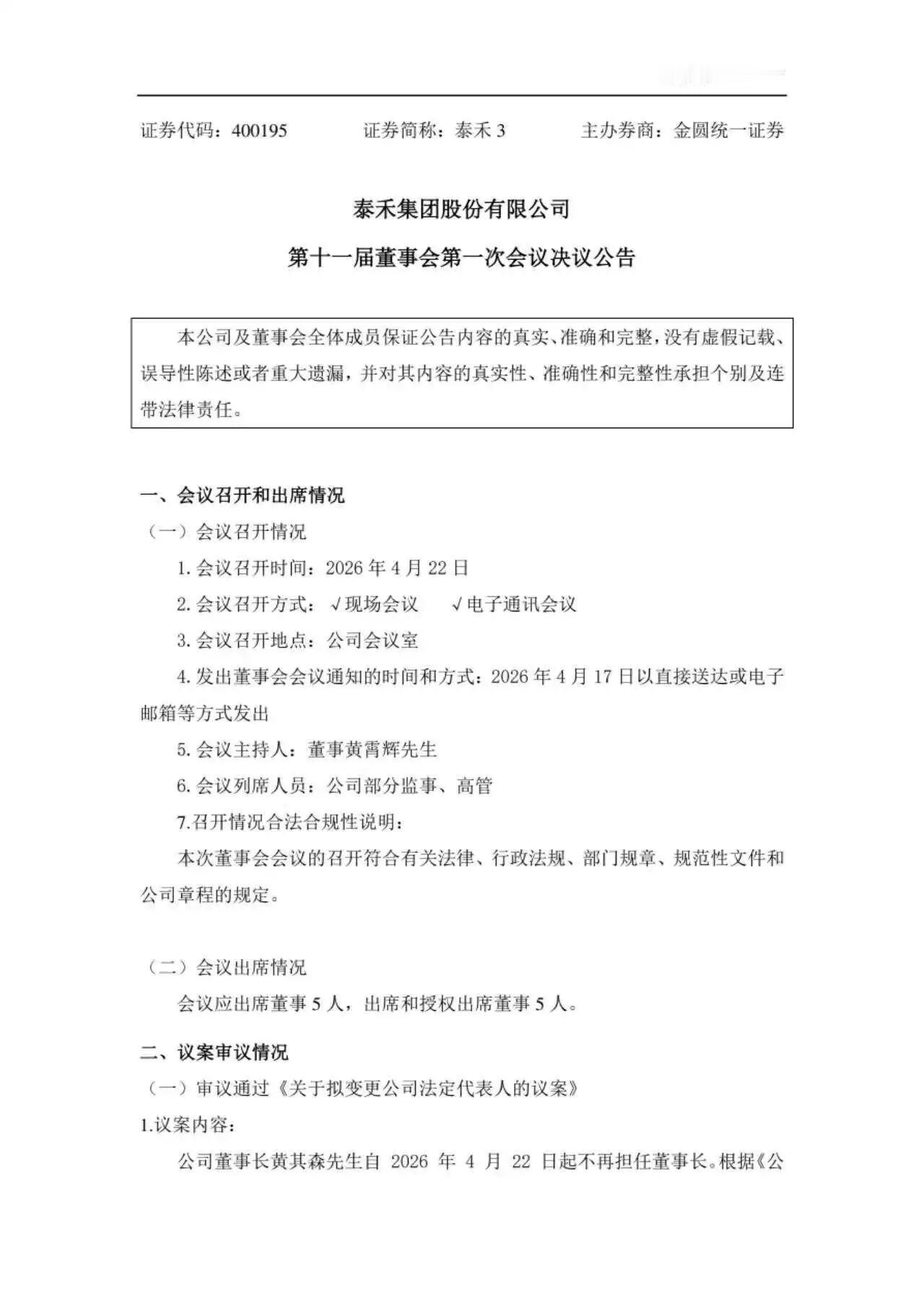 黄其森不再担任泰禾集团董事长,黄霄辉接任! 公告称,公司董事长黄其森先生自2026年4月22日起不再担任董事长。据《公司法》《公司章程》规定,及结合实际情况,拟将公司法定代表人由董事长黄其森先生变更为新任董事林子平先生。