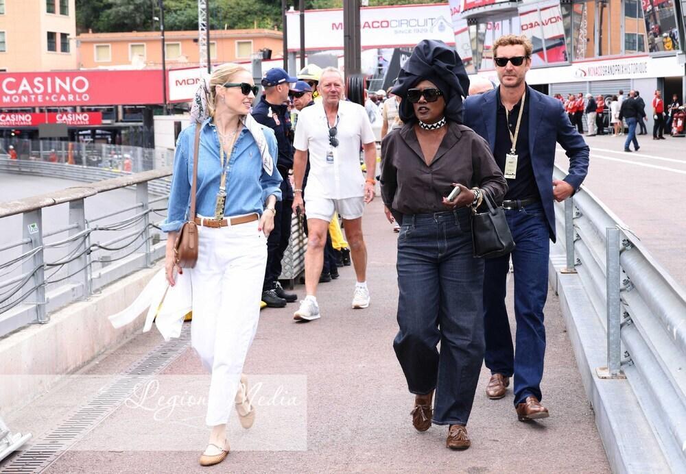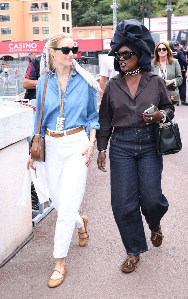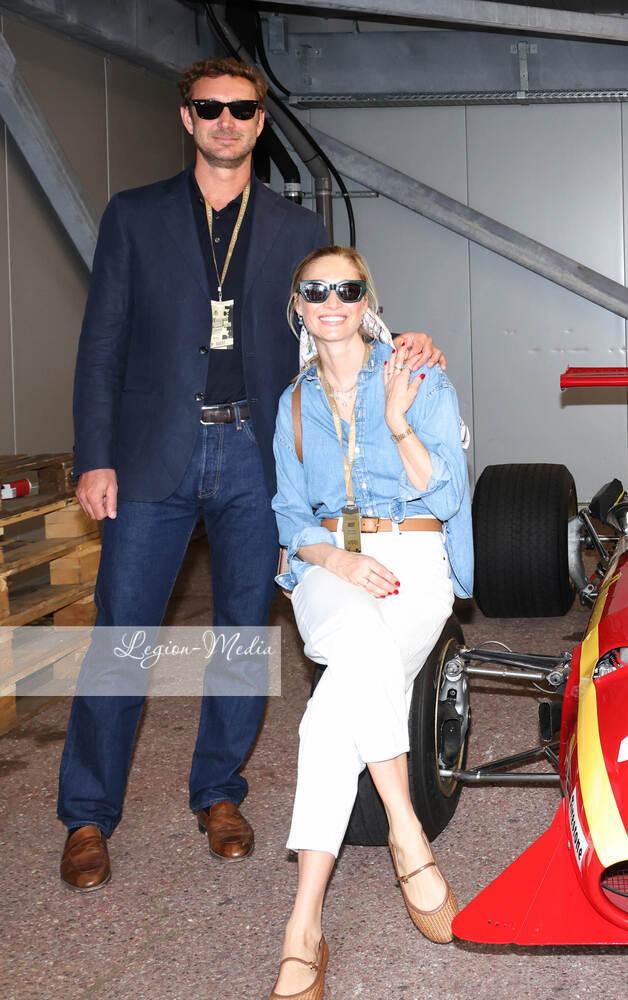 4月25日,摩纳哥卡洛琳公主的次子皮埃尔和次媳碧翠丝观看摩纳哥历史大奖赛,今年是该赛事的第15届,超过200辆历史赛车齐聚赛道,再次展现了摩纳哥与世界赛车运动之间的紧密联系 碧翠丝她选择了一套看似简约却又不失时尚感的装扮:一件牛仔衬衫——本季的一大流行趋势——搭配精致的基础款单品。其中一个关键细节是:系在马尾辫上的丝巾,它彻底改变了整体造型。而珠宝包括耳环、项链和镶嵌海蓝宝石的钻石戒指,既增添光彩又不显得过于张扬