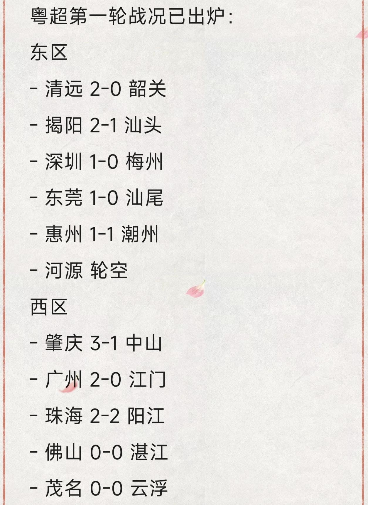 粤超第一轮战况已出炉: 东区 - 清远 2-0 韶关 - 揭阳 2-1 汕头 - 深圳 1-0 梅州 - 东莞 1-0 汕尾 - 惠州 1-1 潮州 - 河源 轮空 西区 - 肇庆 3-1 中山 - 广州 2-0 江门 - 珠海 2-2 阳江 - 佛山 0-0 湛江 - 茂名 0-0 云浮