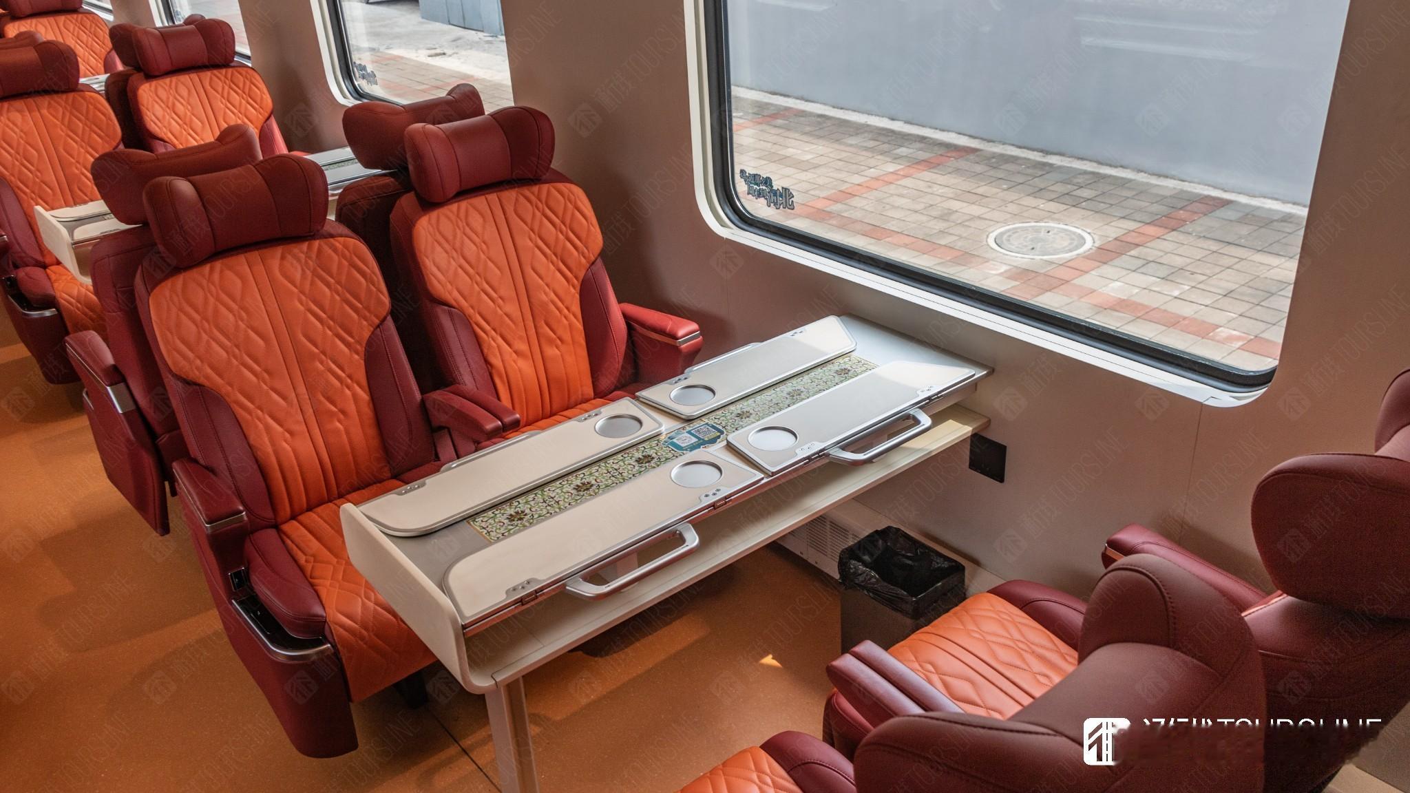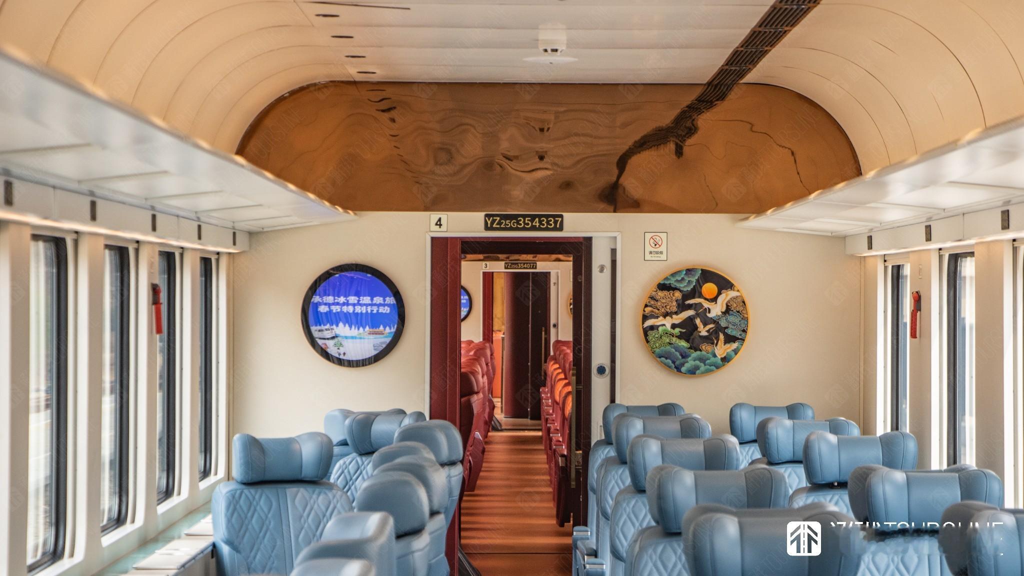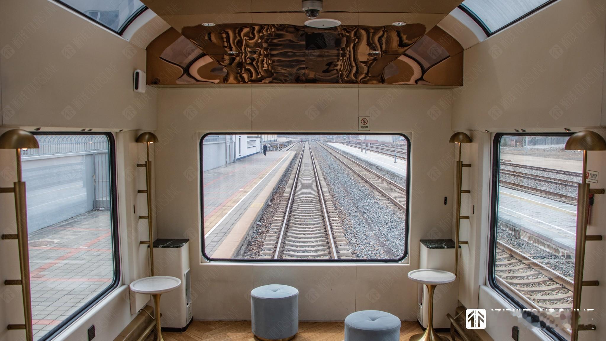 列车车厢内拥有多处值得称赞的小细节。观景车厢与娱乐车厢均配有电致变色玻璃,可通过侧墙按钮进行调节,为了方便观景车厢旅客拍照打卡,相较于运营初期的座位布局,拆除了观景窗附近的四个沙发座椅,腾出了一片较大的活动空间,方便旅客拍照打卡的同时,也提供了列车文娱节目表演的新场地。各节车厢的盥洗台均设计为瓷器外形,质感十足。