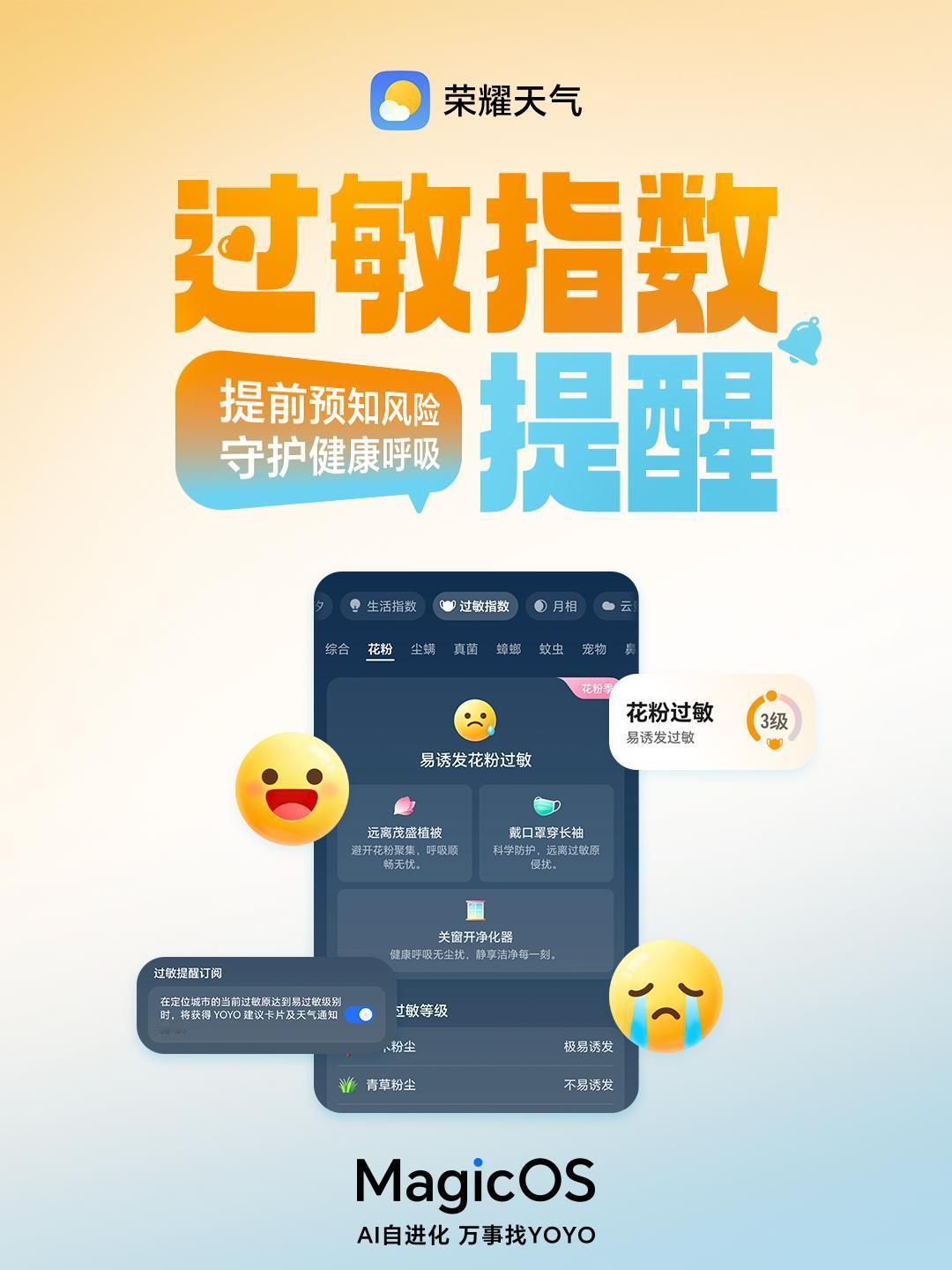 荣耀MagicOS 10又新推出了一个蛮实用的功能:荣耀天气的过敏指数提醒。专为易敏人群打造,能够帮助小伙伴们提前规避过敏风险,守护健康呼吸。支持监测花粉、尘螨、真菌、蟑螂、蚊虫、宠物等13类常见过敏原,覆盖生活中主要的过敏诱因。 过敏指数提醒尤其针对春季高发的花粉过敏做了重点优化。用清晰的等级和图标直观展示当前过敏风险。提供针对性防护建议,比如远离植被、戴口罩穿长袖、关窗开净化器等,让防护更科学。小伙伴们开启过敏提升订阅之后,多种提醒方式告知大家。 开启方式:荣耀天气App>过敏指数板块>切换到花粉/尘螨,一键订阅提醒。现在只需关注 @超逸谈科技 并转发此微头条,2026年03月28日,将由 @头条抽奖 @头条抽奖平台选出1位粉丝包邮送出暖暖杯55度礼品装,说不定下一个中奖的就是你哟 。抽奖详情