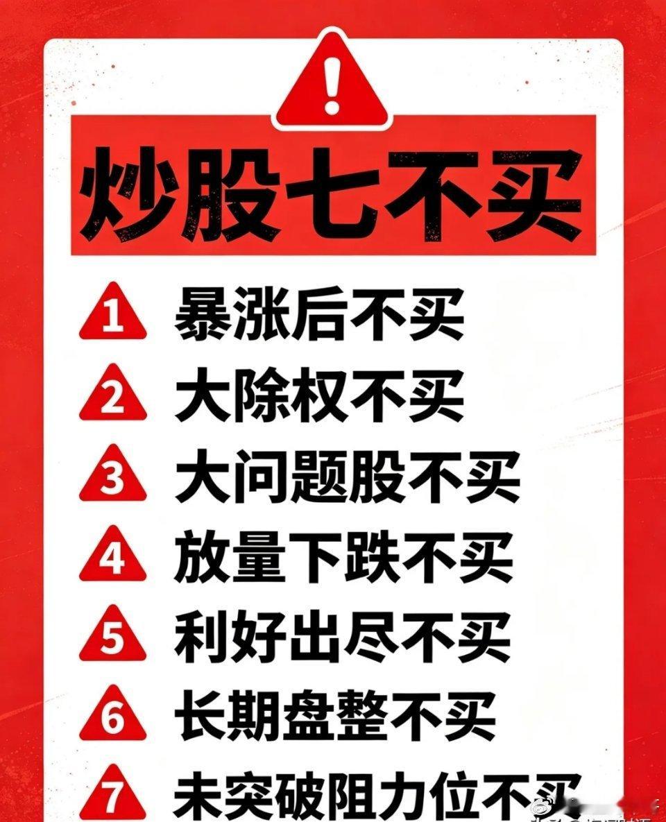 ❌七不买1.高位暴涨妖股不碰2.放量破位个股不抄3.业绩暴雷个股不碰4.主力出逃个股不进5.长期阴跌个股不买6.纯热点垃圾股不碰7.全网一致唱多不追