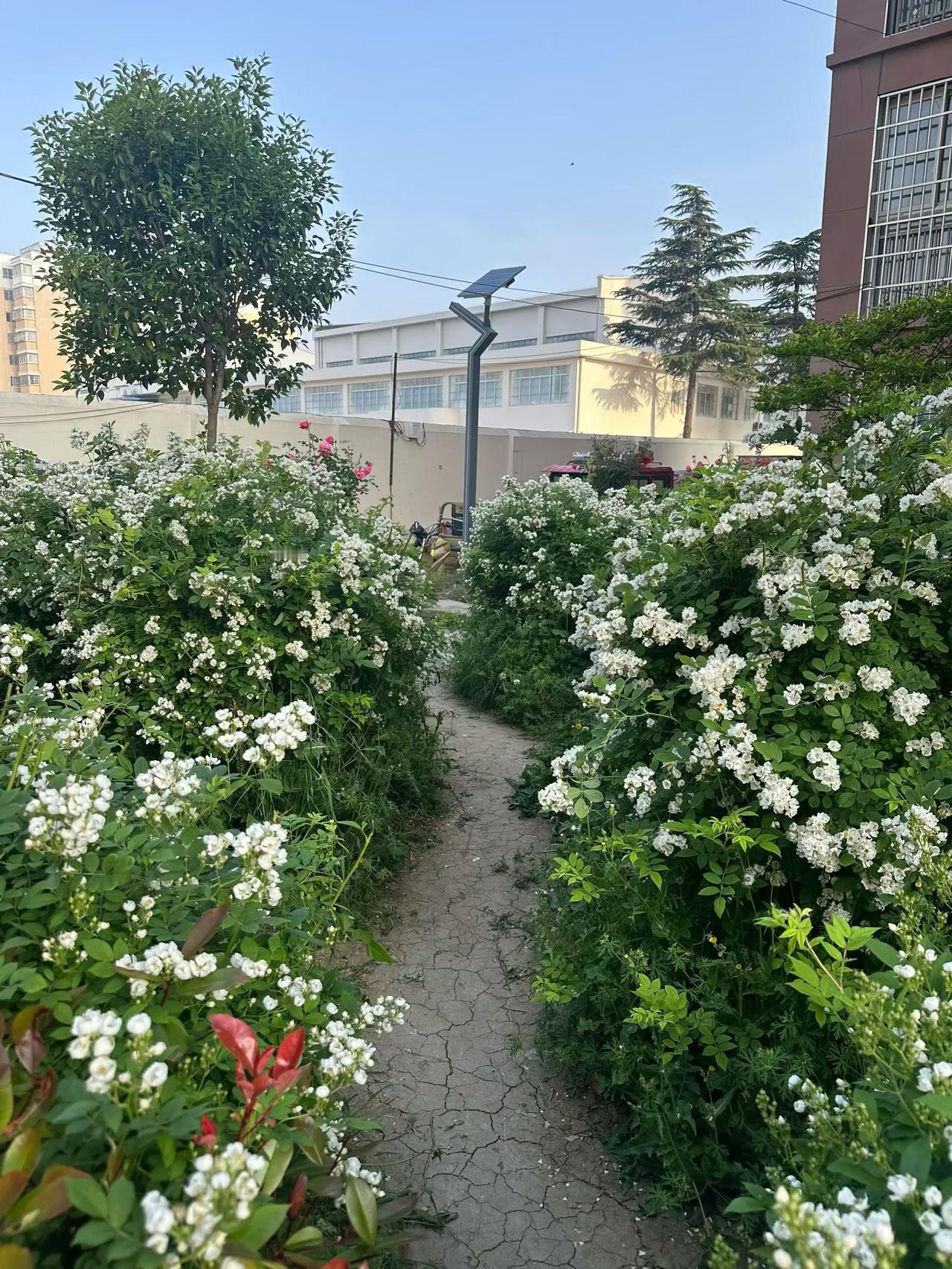 没有刻意修剪的枝桠,顺着路的轮廓肆意生长,把寻常的小区角落,铺成了一条漫着香气的秘密通道。 偶尔夹杂的几朵粉花,像藏在白浪里的小惊喜,悄悄给路过的人递上一份春天的温柔。 脚步放轻些吧,别惊扰了这满径的花事。